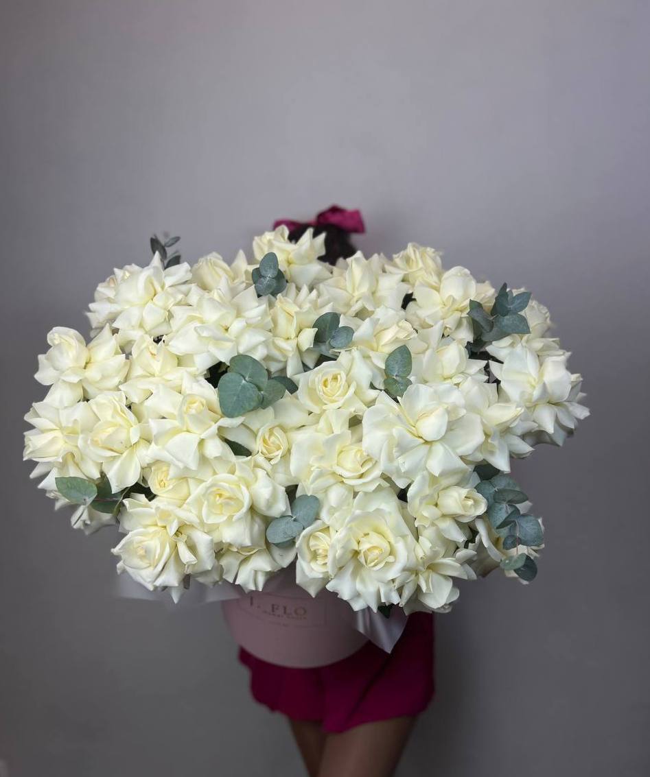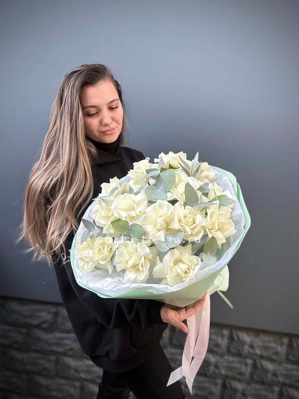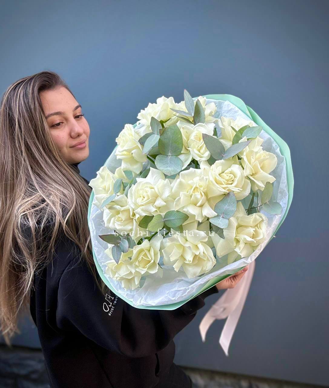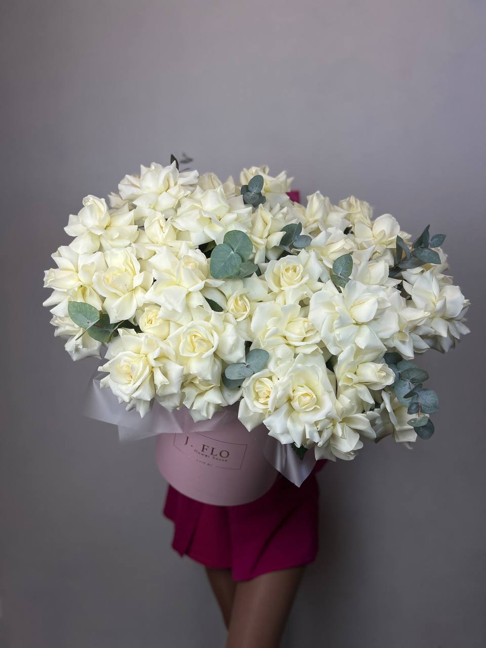 Пятнадцать вывернутых роз Джумилия раскрывают свою многослойную структуру в каждом бутоне. Эвкалипт обрамляет композицию, подчёркивая фактуру лепестков.