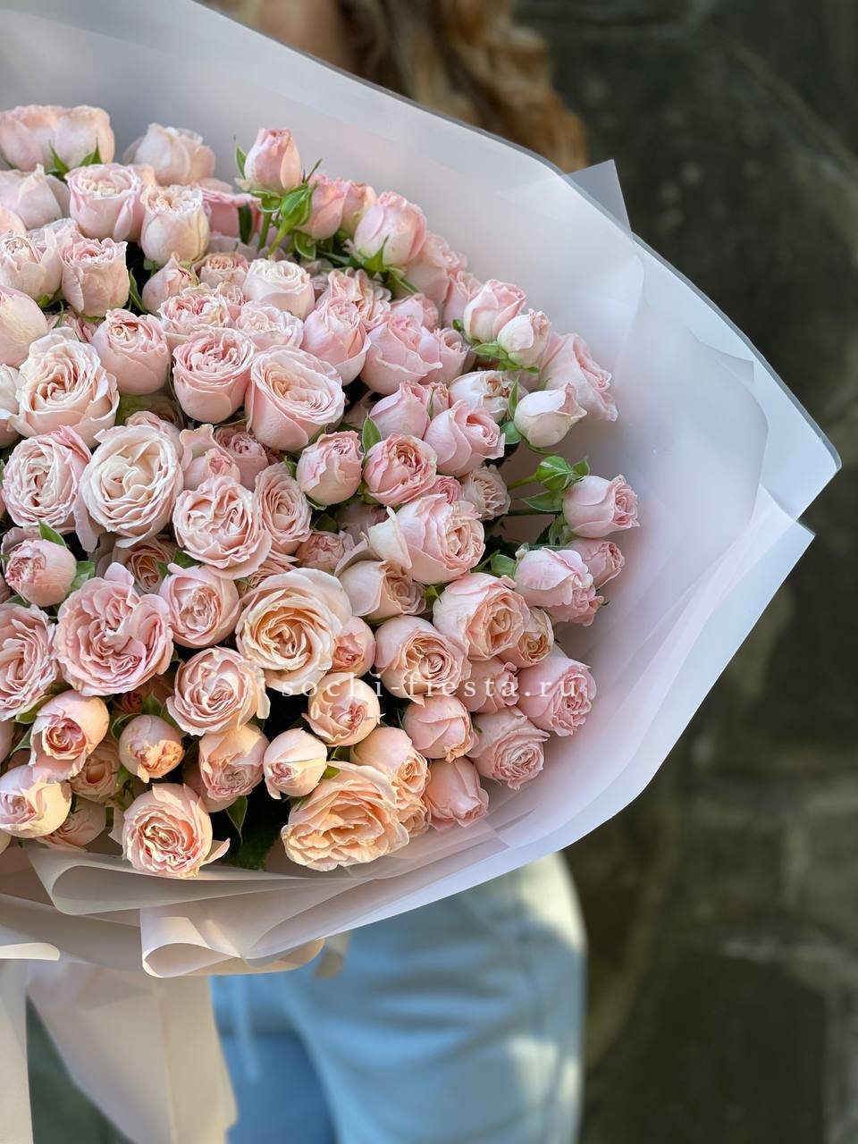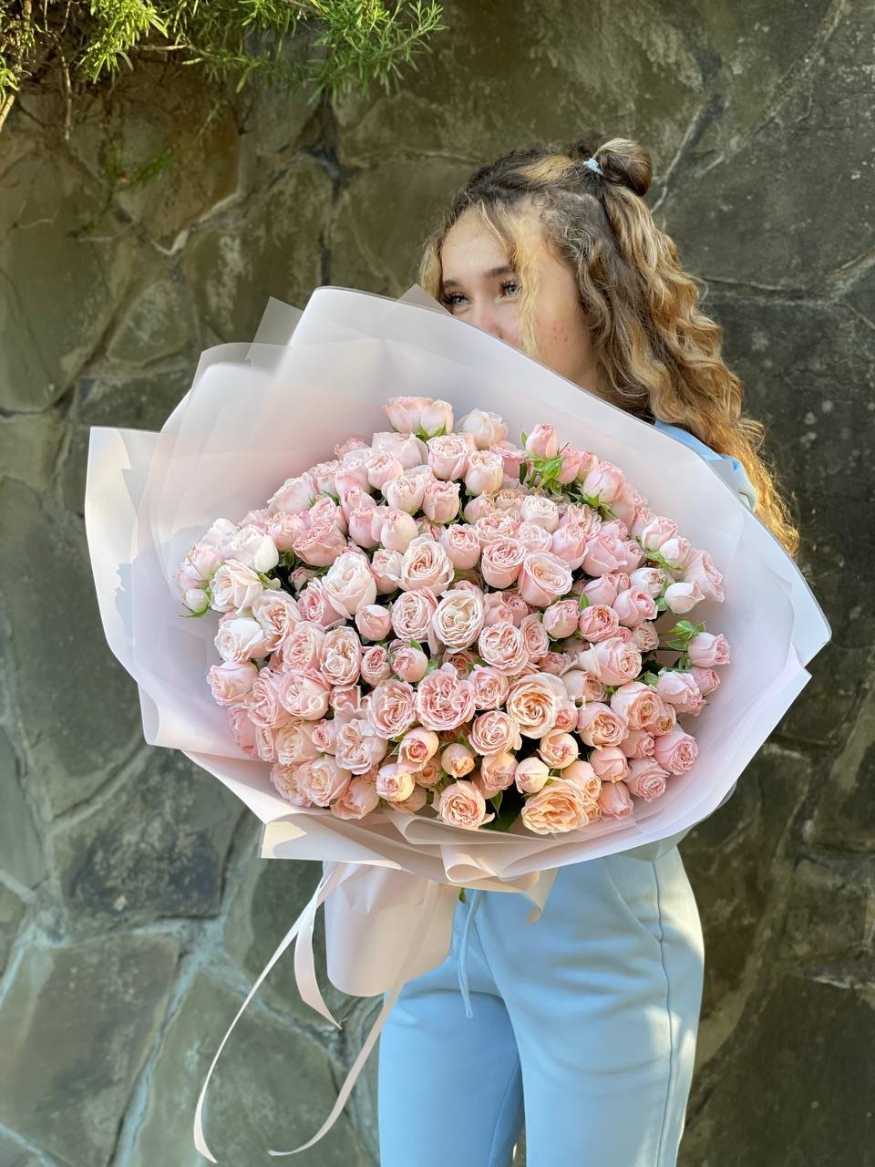 Пятьдесят один бутон в мягкой бело-розовой гамме создает объемную форму с живым ритмом. Микс оттенков добавляет воздушности и естественной динамики композиции.