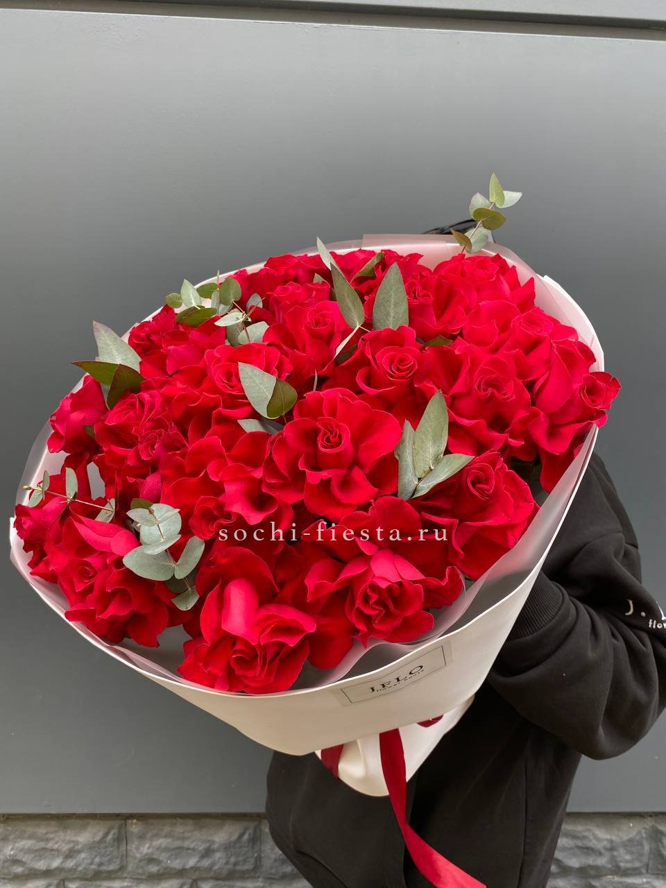 Пятьдесят один бутон лилий собраны в объёмную композицию с выразительным силуэтом. Крупные соцветия создают впечатляющее присутствие и заполняют пространство живым цветом.