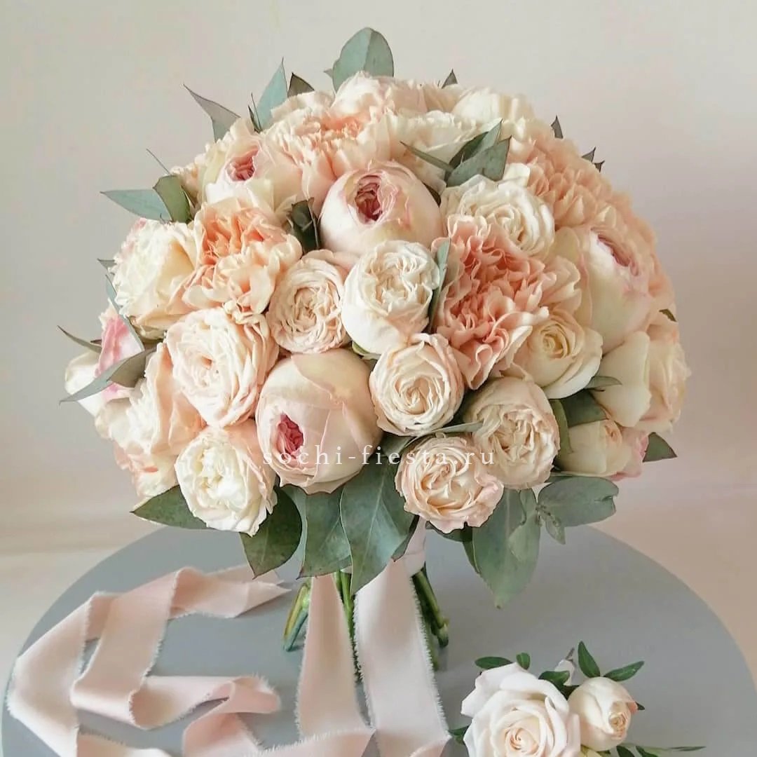 пионовидная кустовая кустовая роза Мисти Баблс, статица, лента, дизайнерская упаковка.