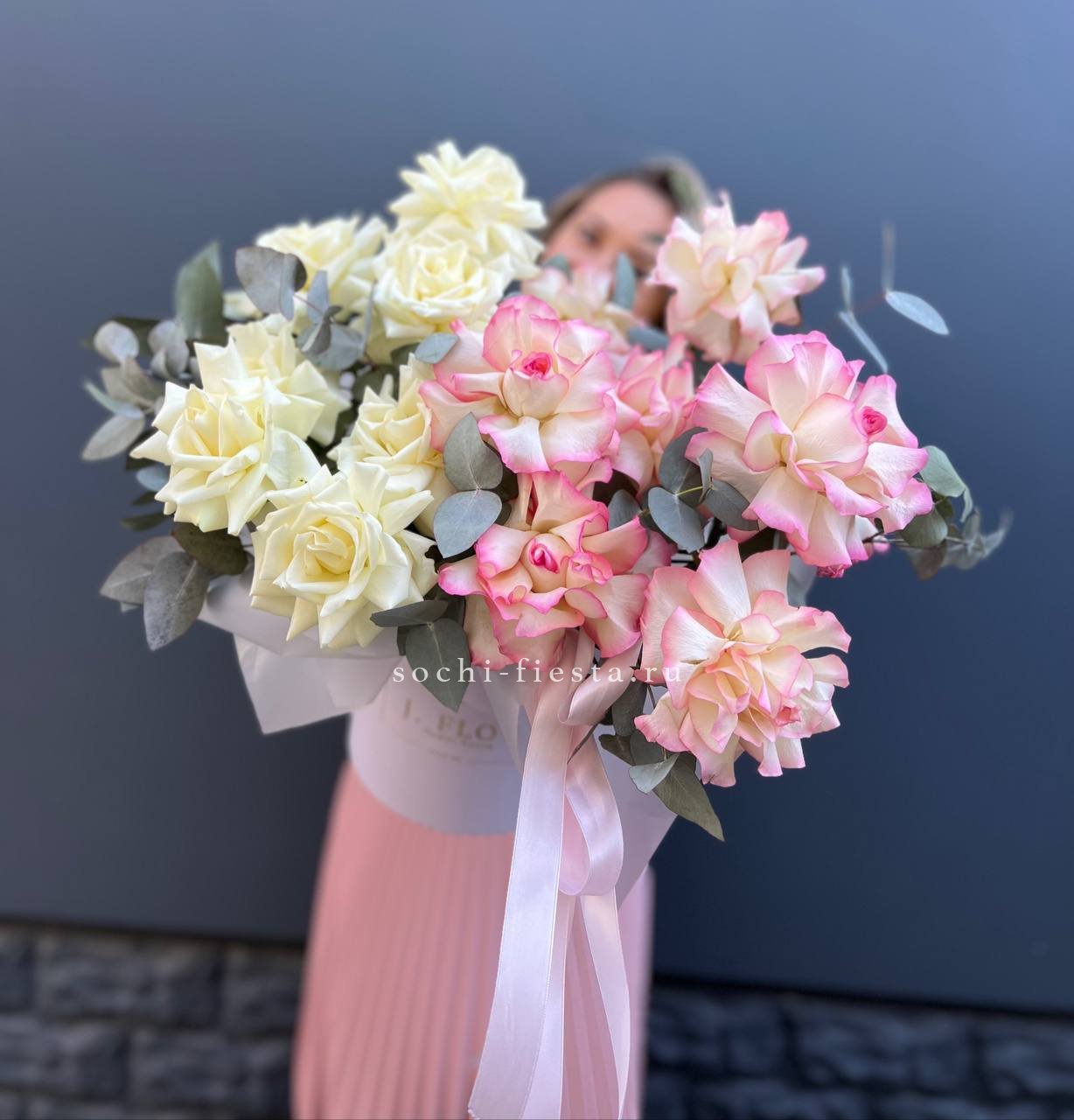 бомбастик, роза, эустома, диантус, эвкалипт, авторская упаковка, лента.