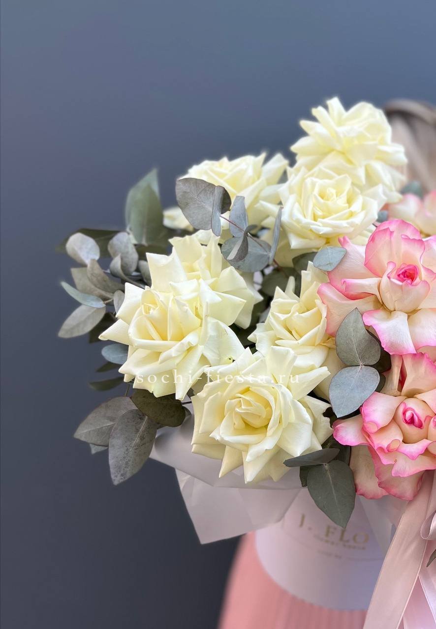 Пышные розы Бомбастик собраны в плотную округлую форму и дополнены воздушными соцветиями эустомы. Диантус добавляет фактурные акценты, а эвкалипт создает мягкий контур по краю композиции.