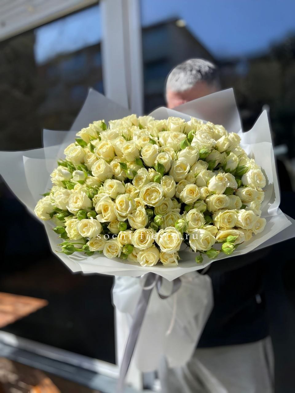 Белоснежные бутоны собраны в лаконичную форму с воздушной текстурой упаковки. Чистота линий и свежесть делают композицию универсальной для любого момента.