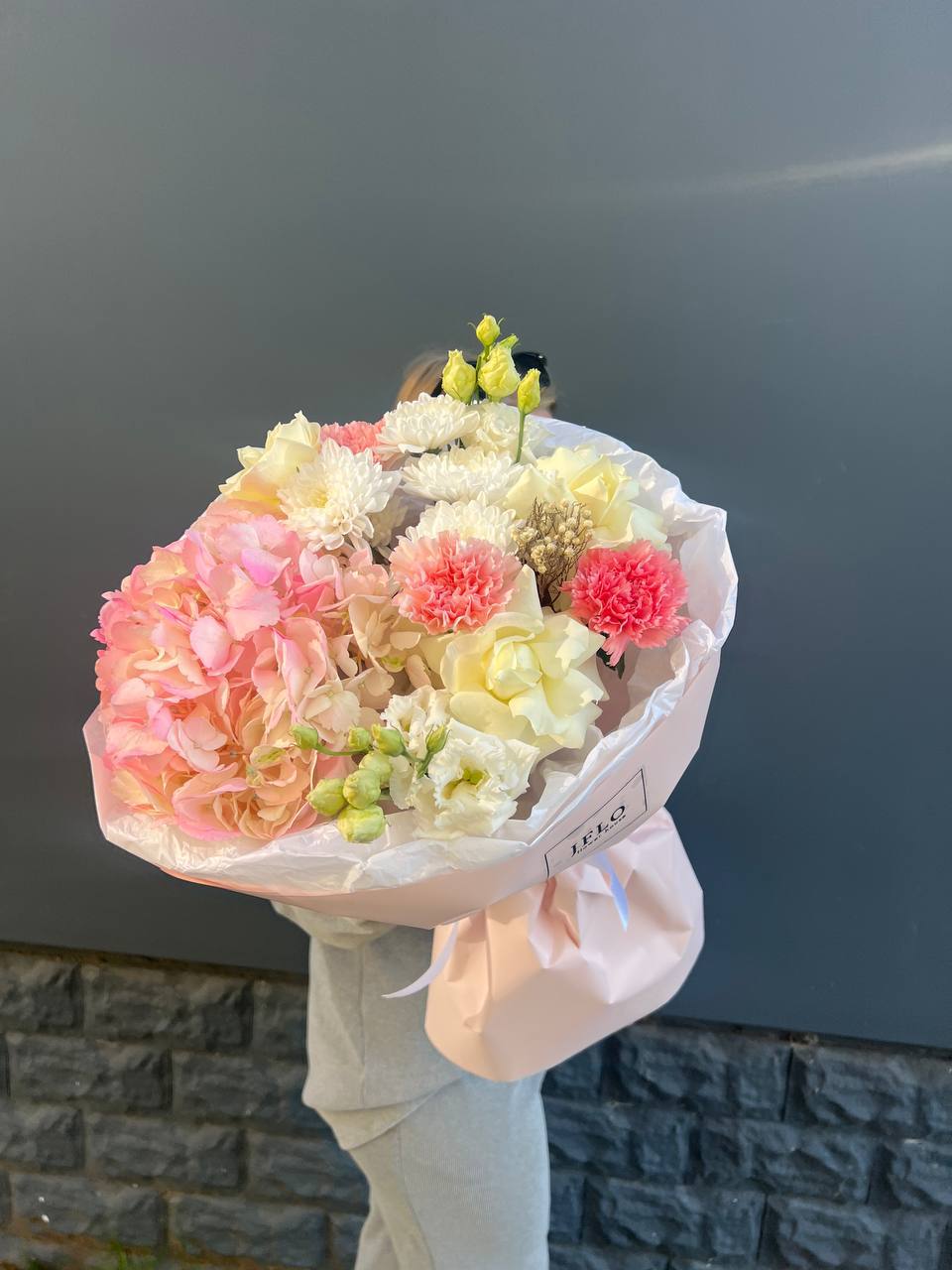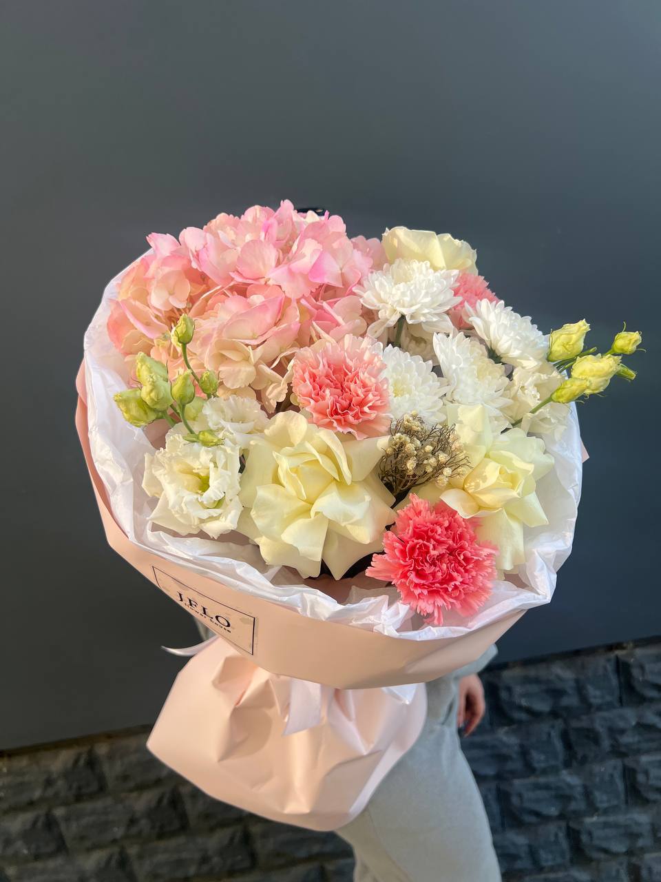 Семь соцветий гортензии раскрываются воздушным облаком с мягкими переходами оттенков. Букет дарит ощущение лёгкости и свежести летнего сада в любое время года.