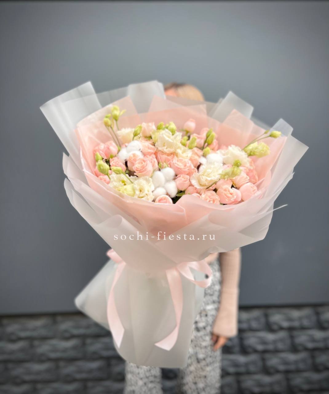 кустовые розы, эустома, хлопок, лента и дизайнерская пленка.
