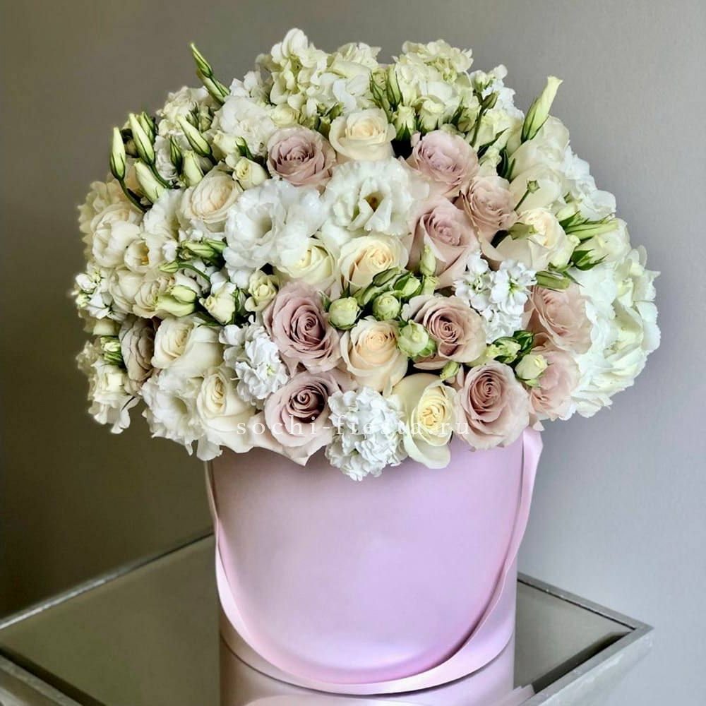 Пастельная гамма с мягкими переходами от кремового к лавандовому создаёт спокойное и цельное впечатление. Кустовые розы и эустома дополнены фактурными коробочками хлопка. Компактная форма удобна для размещения в любом интерьере.