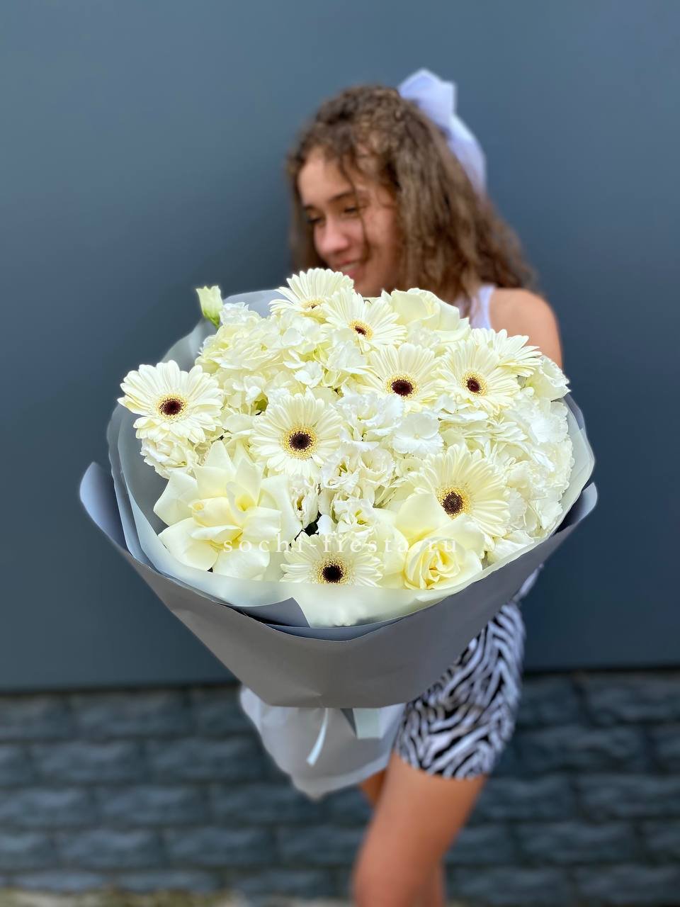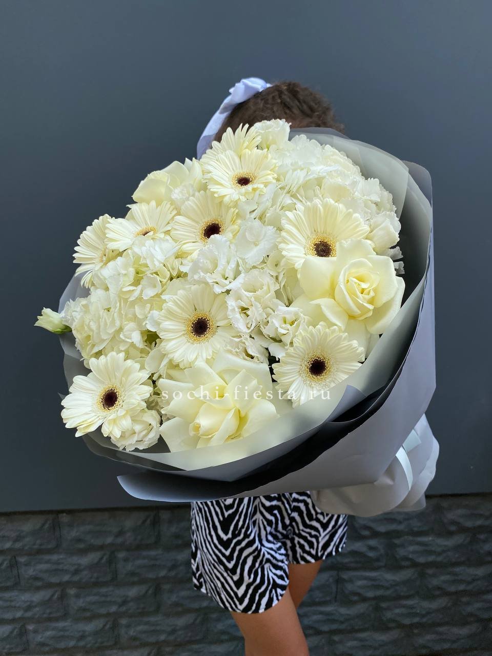 гортензия, герберы, белые розы, эустома,  лента и дизайнерская пленка.