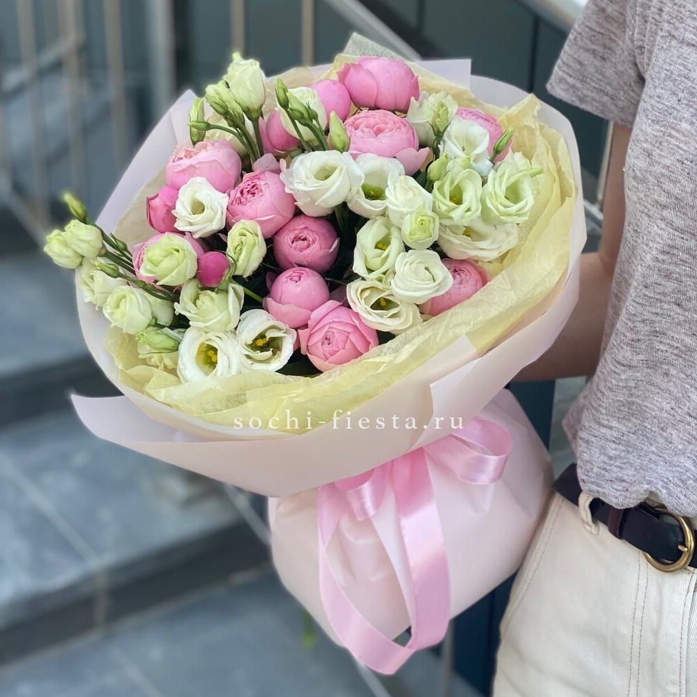 Розовая гортензия и эустома раскрывают свою красоту в каждом лепестке. Мягкие оттенки переходят один в другой, создавая спокойное и гармоничное впечатление.