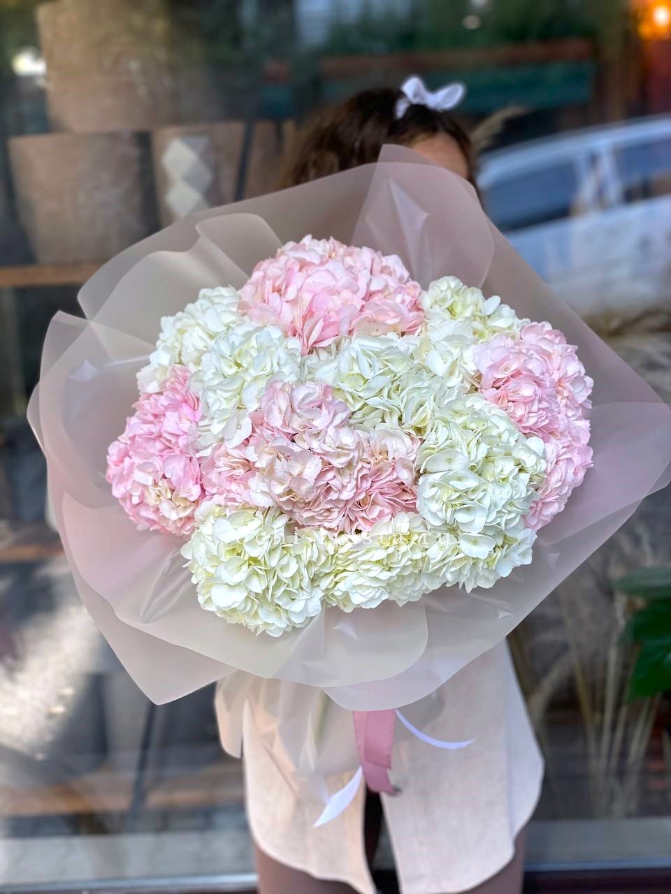 Девятнадцать соцветий гортензии собраны в объемную композицию с естественной воздушностью. Каждая головка раскрывается множеством мелких лепестков, создавая плотное цветовое облако.