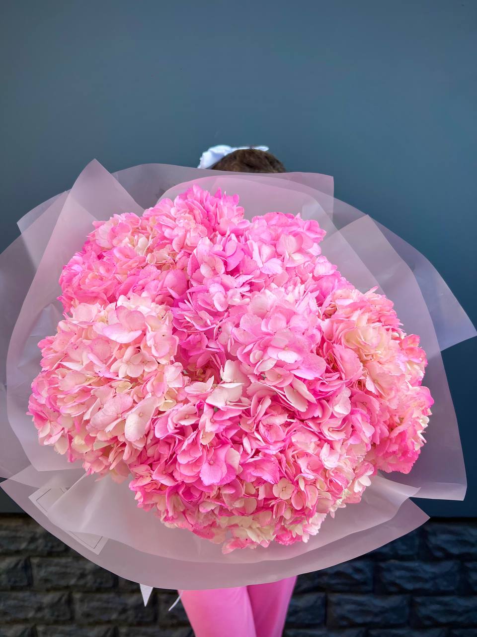 Воздушные шапки соцветий собраны в пышную охапку белоснежного цвета. Гортензия создаёт объёмную текстуру и заполняет пространство мягким природным светом. Букет для тех, кто ценит чистоту линий и естественную красоту.