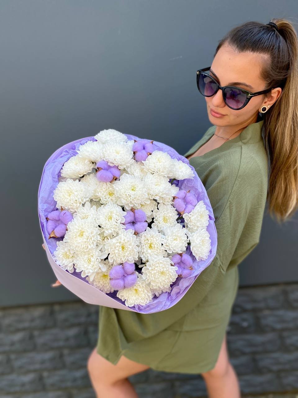 минимальный состав: 7 одноголовых хризантем, лента, упаковка на выбор.