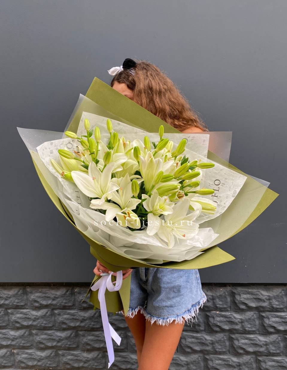 Насыщенный зелёный оттенок упаковки перекликается с природной свежестью лилий. Семь бутонов формируют объёмную композицию с выразительным цветовым акцентом. Букет привлекает внимание и удерживает его надолго.
