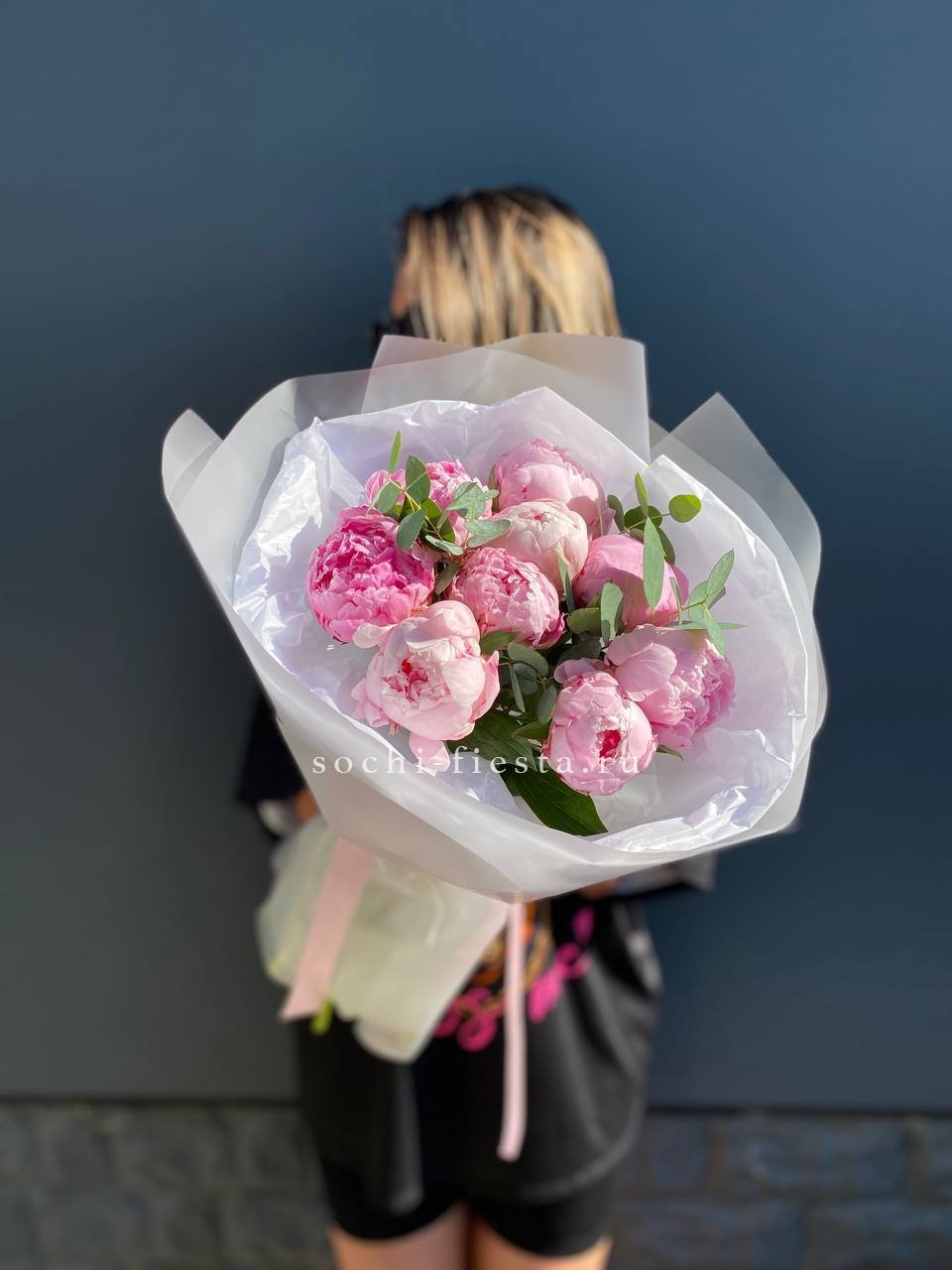 9 пионов, эвкалипт, лента, дизайнерская упаковка.