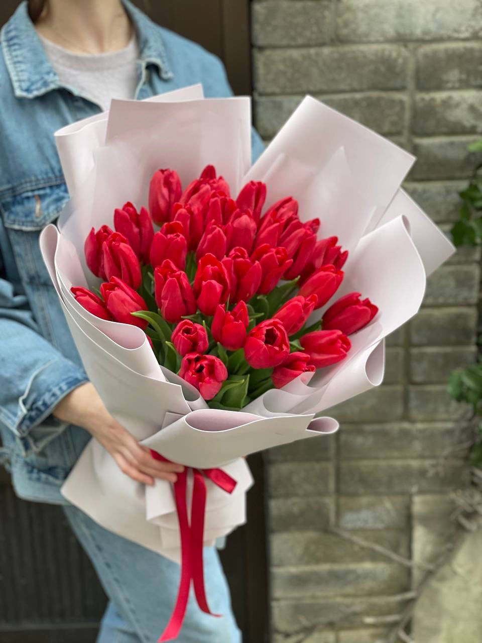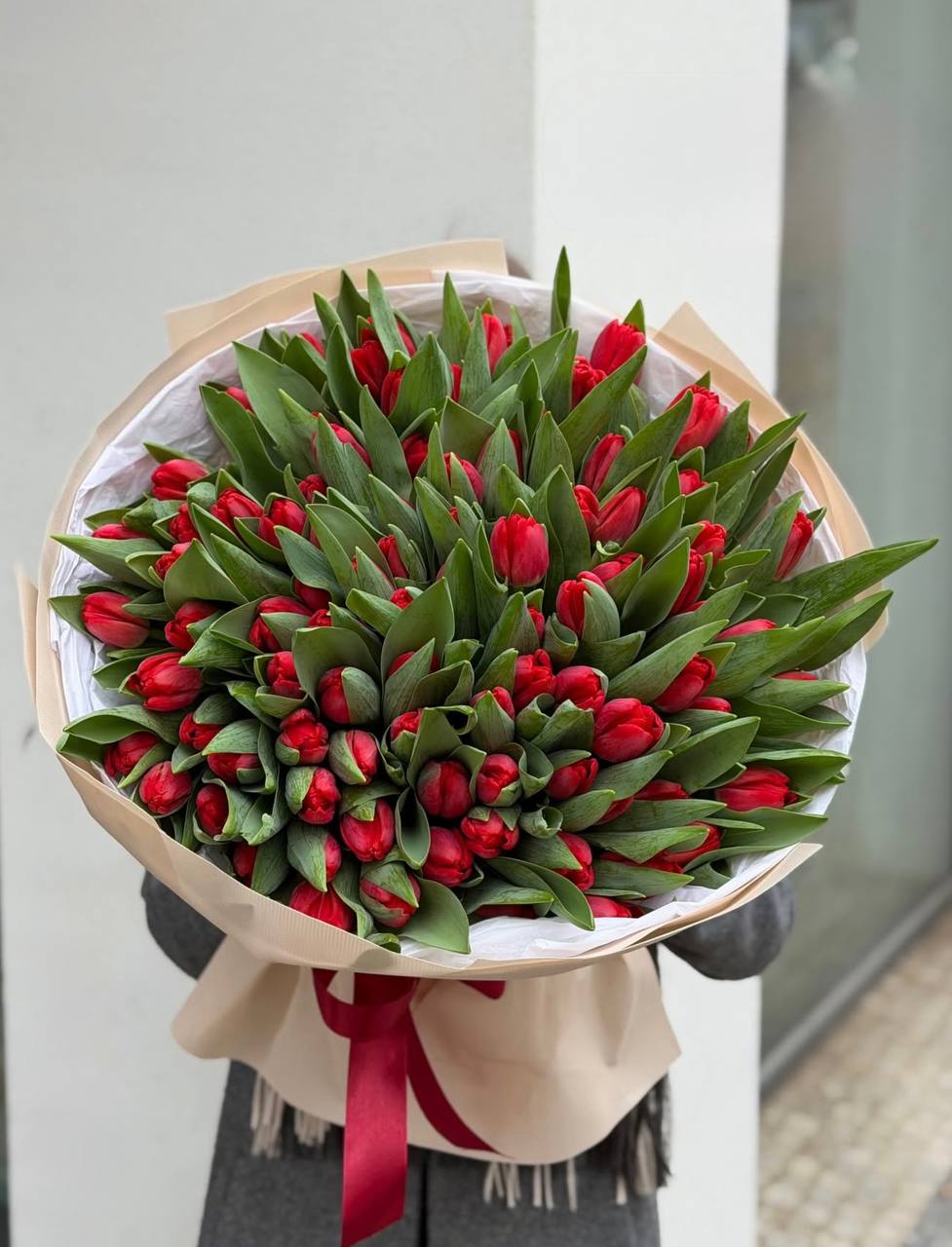 Тридцать пять стеблей выстроены в динамичный вертикальный силуэт. Красный цвет звучит ярко и собранно, а линии букета держат чёткий ритм без лишних деталей.
