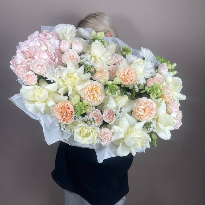 • Редкий состав — David Austin, ранункулюс, анемоны, сезонные пионы.