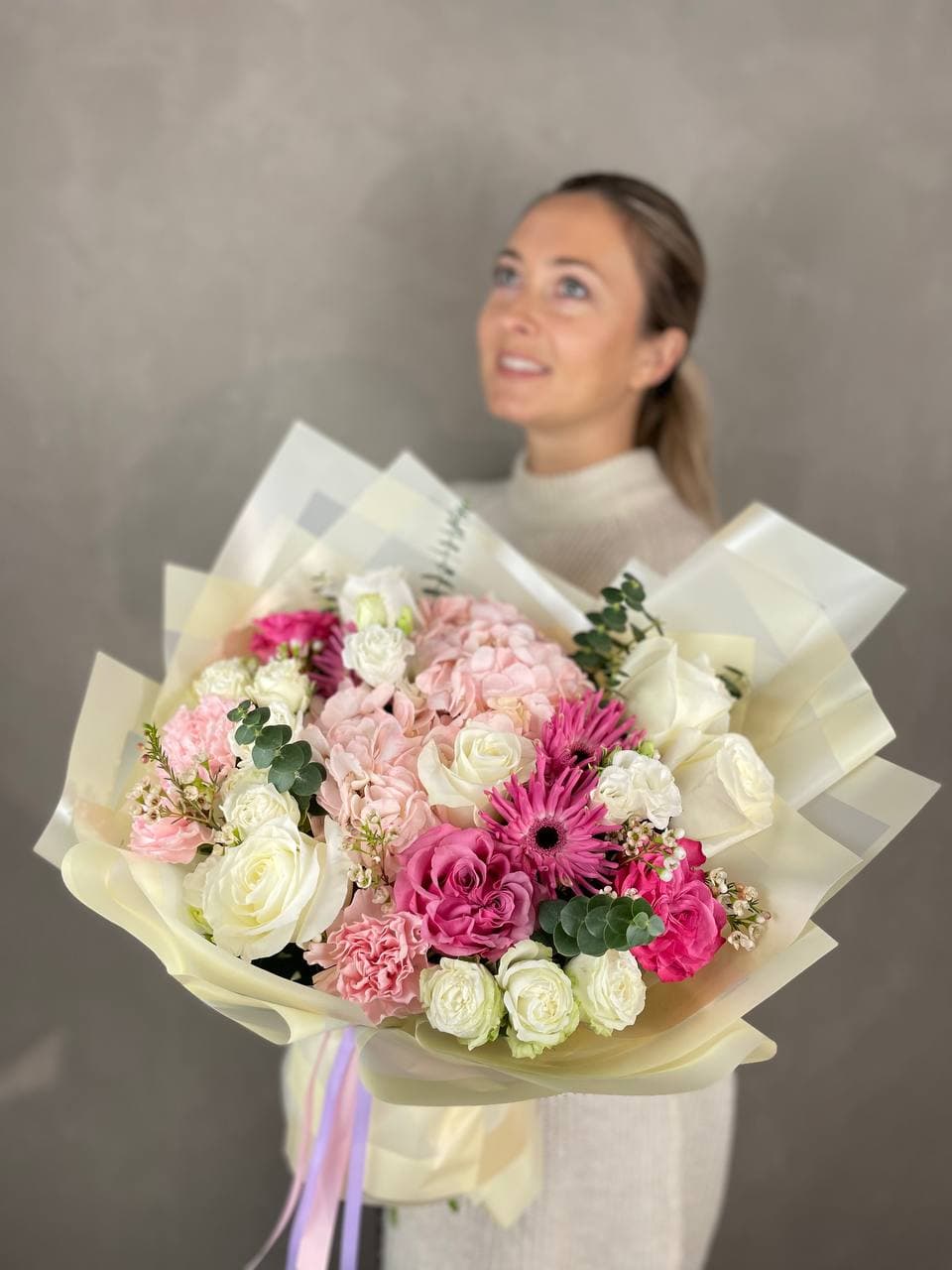 Композиция с плотными пионовидными розами и воздушной гортензией создаёт живописную игру форм. Экзотическая гербера добавляет яркий акцент, а хамелациум заполняет пространство между крупными бутонами.