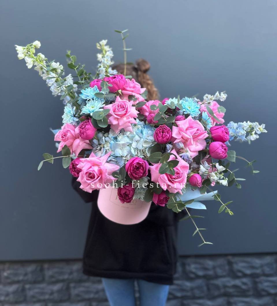 гортензия, розы, пионовидные кустовые розы, эутстома, листья монстеры (или стрелиции), озотамнус, декоративная зелень, дизайнерское оформление.