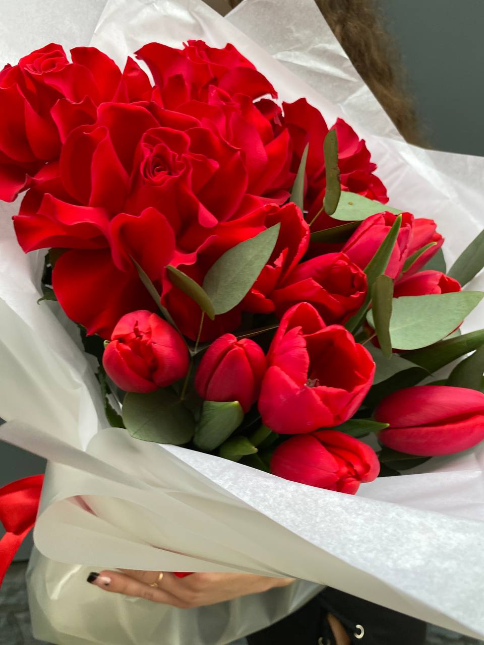 Красные тюльпаны переплетаются с розами в динамичной композиции, где весенняя лёгкость встречается с классической формой. Два цветка в одном букете создают визуальную глубину и живой ритм.