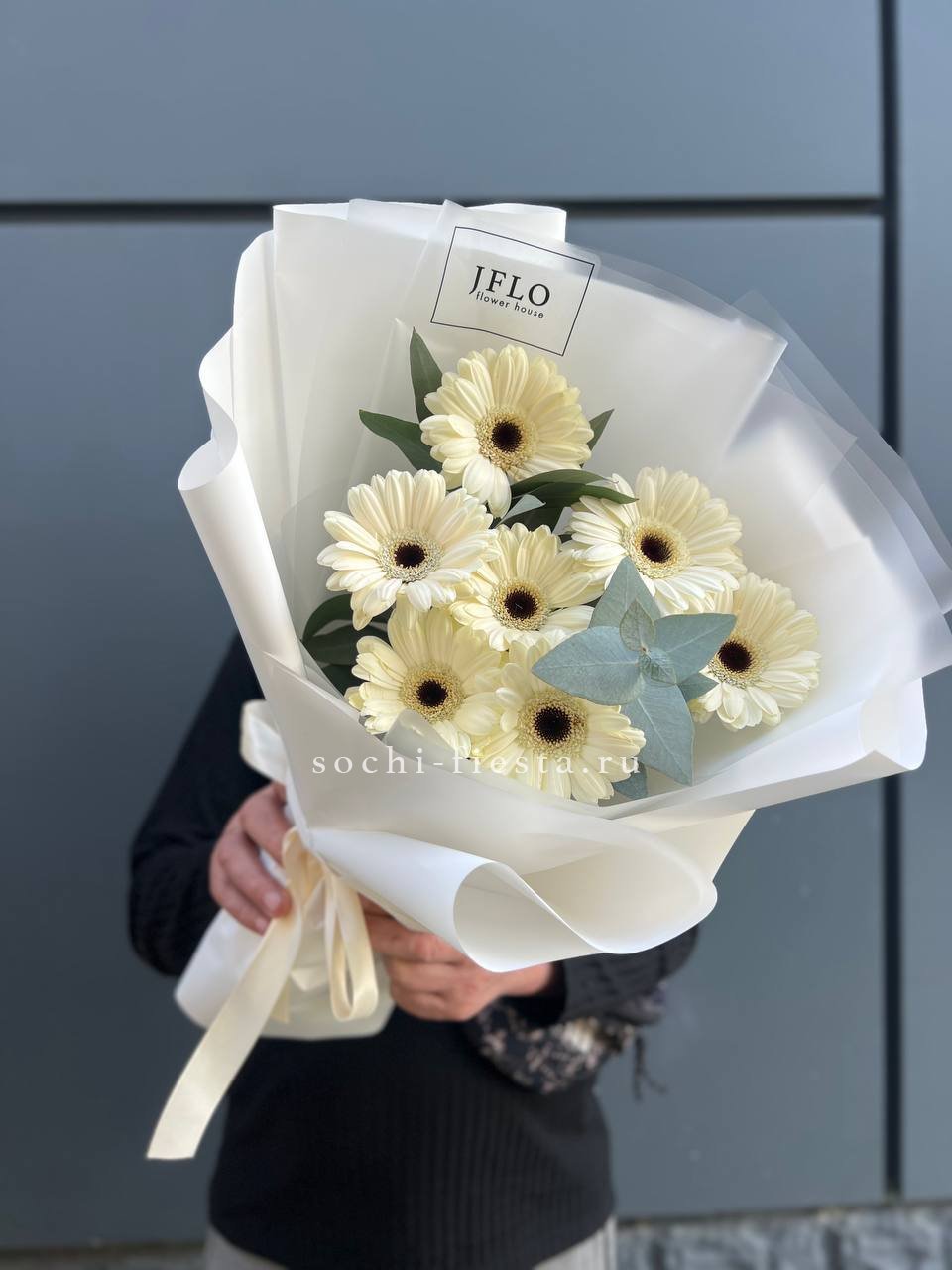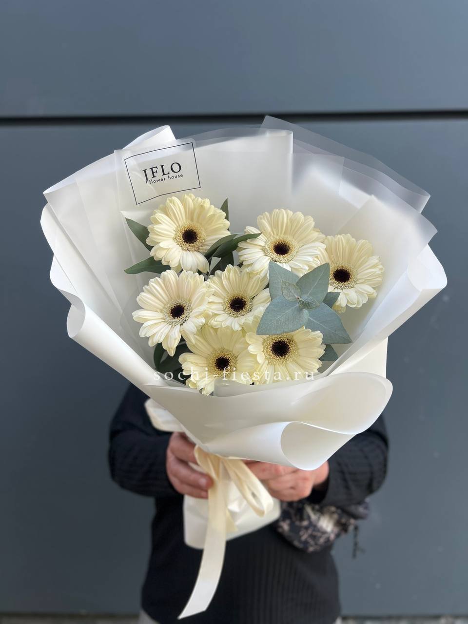 герберы, эустома, белая роза, эвкалипт, лента, сумка-кашпо.