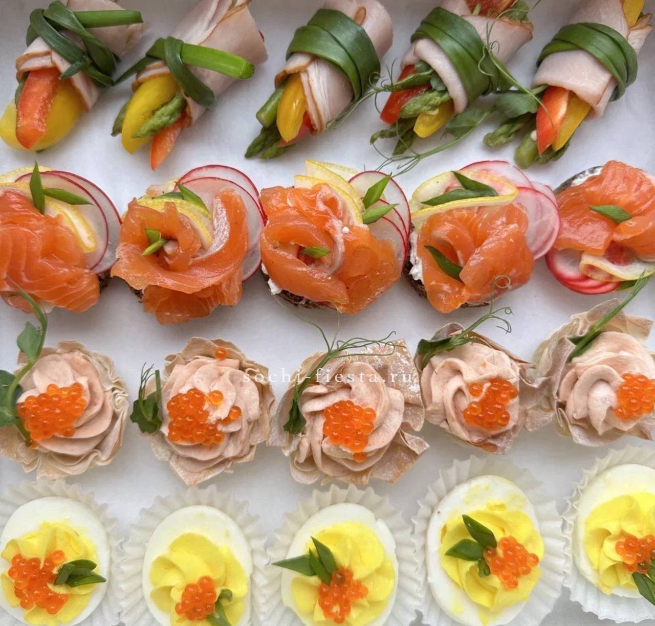 греческая- 3 шт. С рукколой и креветками- 3 шт. С имбирным тунцом- 3 шт. С перцем и зеленью- 3шт. С морепродуктами и чукой- 3 шт.