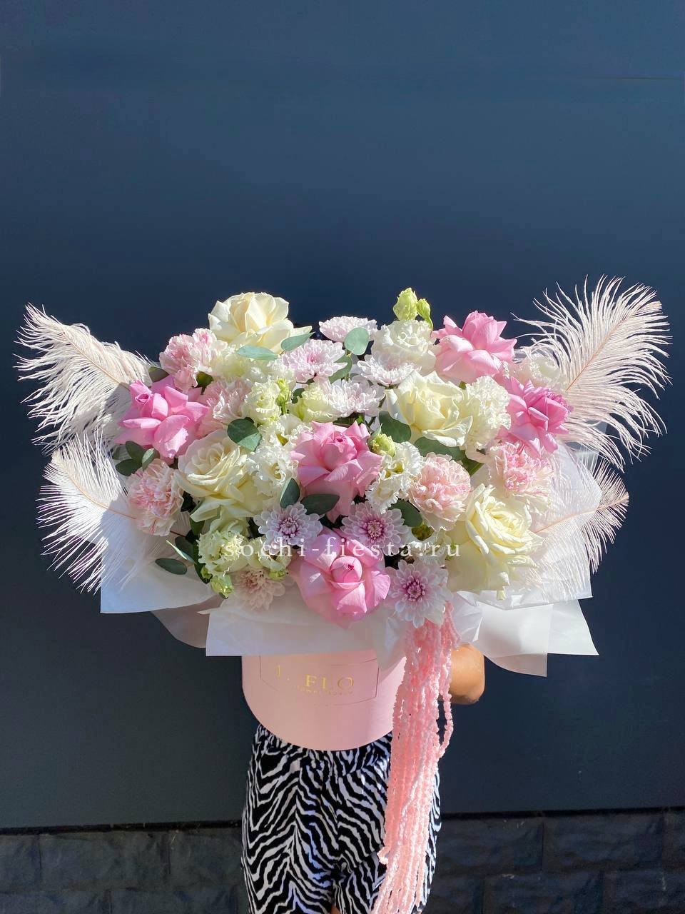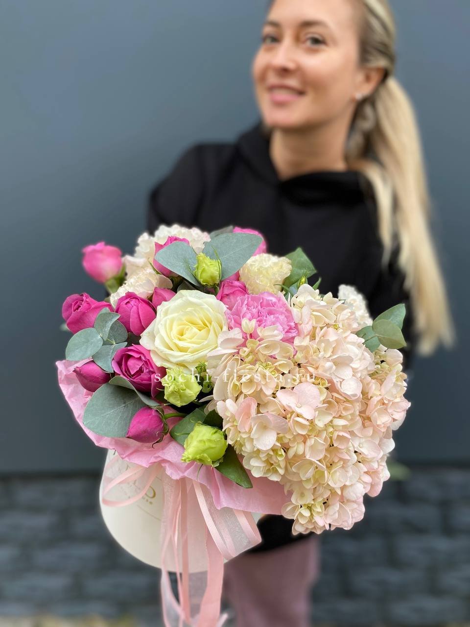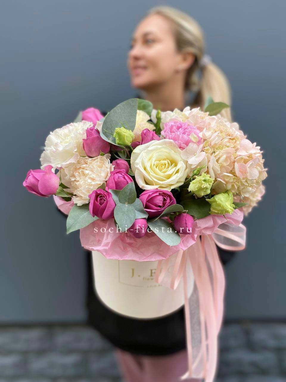 Белоснежные розы и воздушная эустома соседствуют с пышной гортензией и яркими вспышками статицы. Композиция собрана плотно, каждый цветок находит своё место в общем ритме.