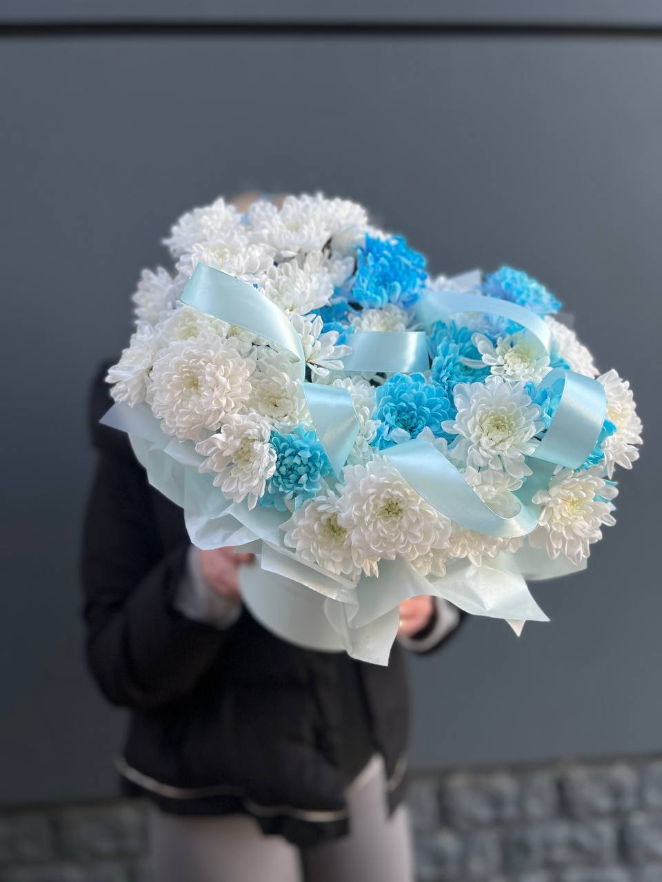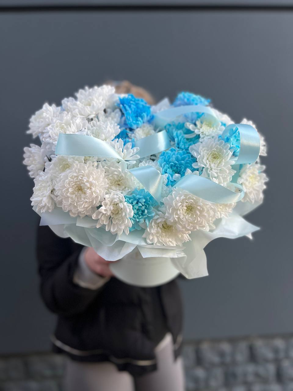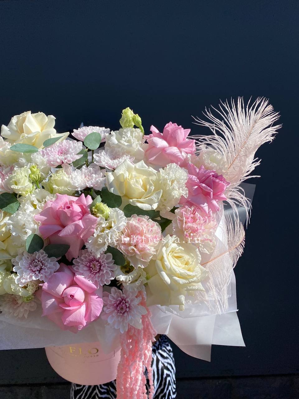 Белоснежные розы и воздушная эустома соседствуют с пышной гортензией и яркими вспышками статицы. Композиция собрана плотно, каждый цветок находит своё место в общем ритме.