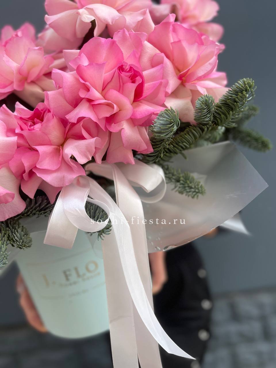 Пятнадцать роз Мандала в боксе образуют плотную шапку с густыми многослойными бутонами. Нобилис добавляет фактурную глубину и завершает композицию.