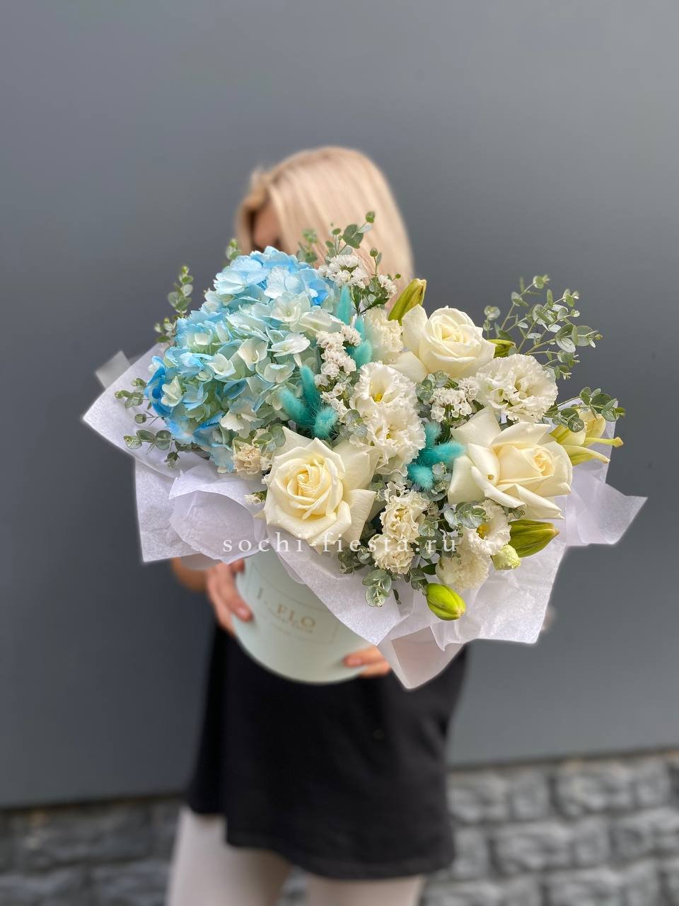 пионовидная роза сорта Мисти бабблс, эвкалипт в коробке или корзине.