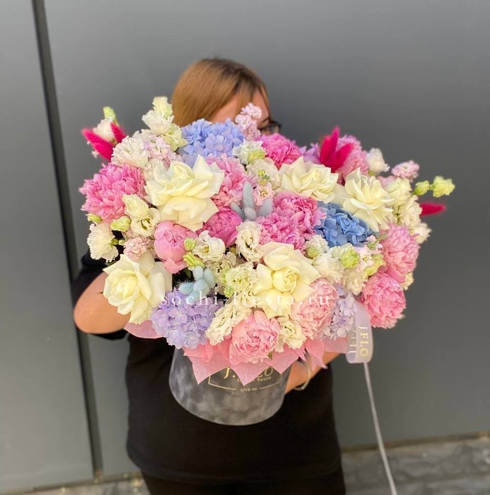 Пионы и гортензия занимают центральную часть, окружённые белыми розами и соцветиями эустомы. Маттиола вносит воздушность в плотно собранную форму.