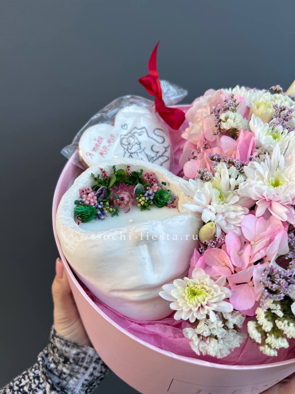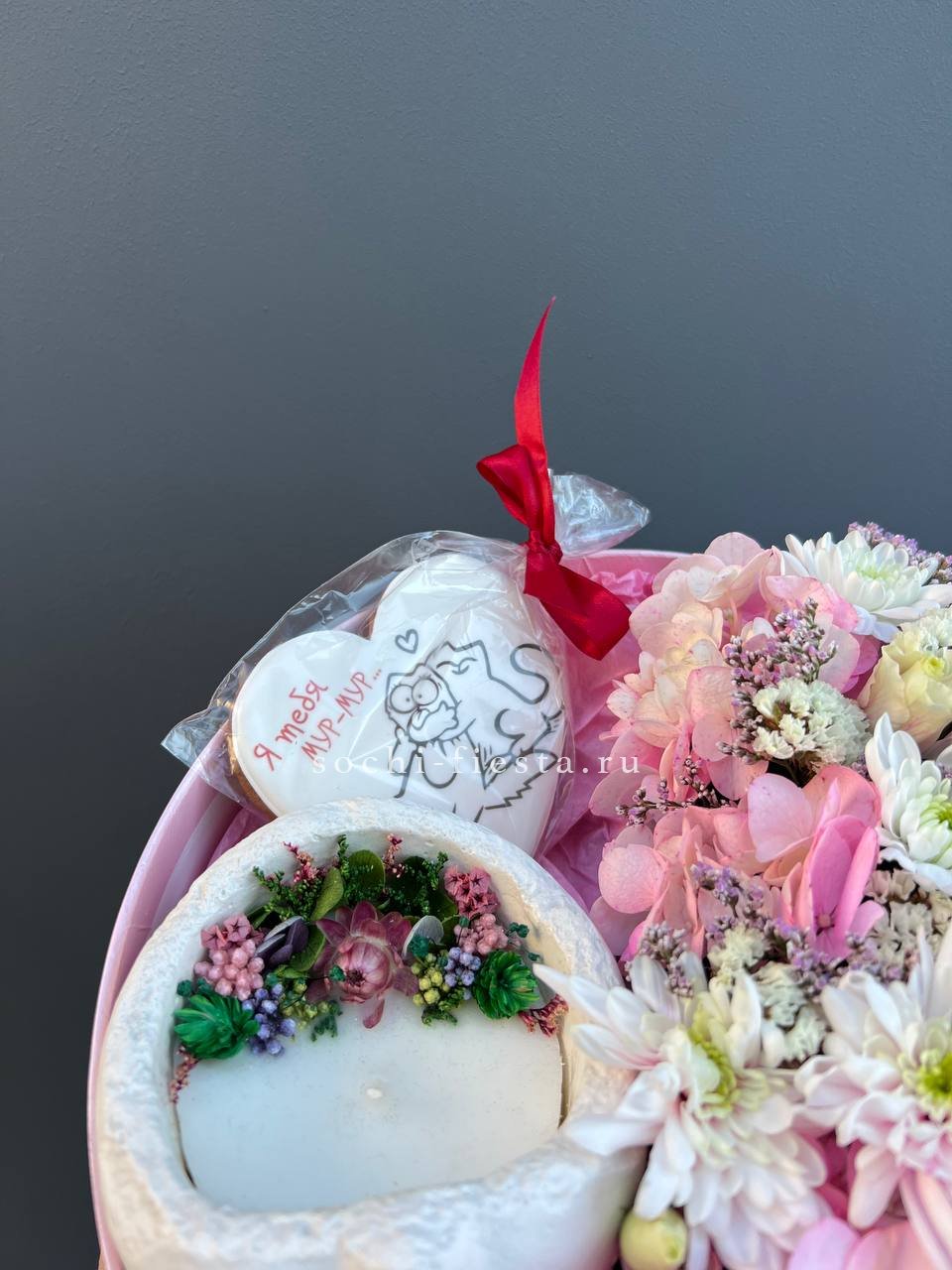 кокосовая свеча декоративная гипсовая, имбирный пряник, хризантемы, гортензия, статица (аналог), эустома, коробка.