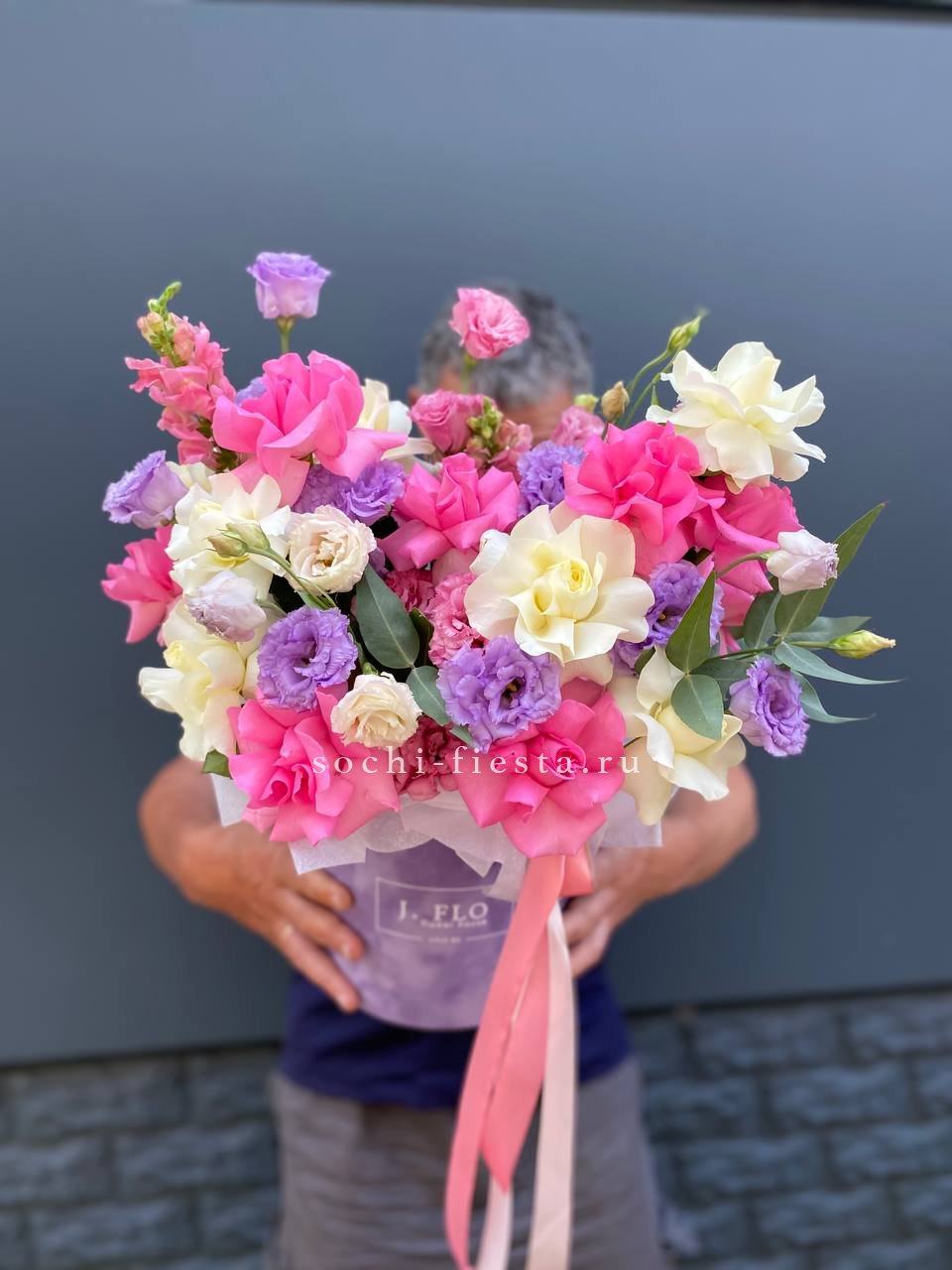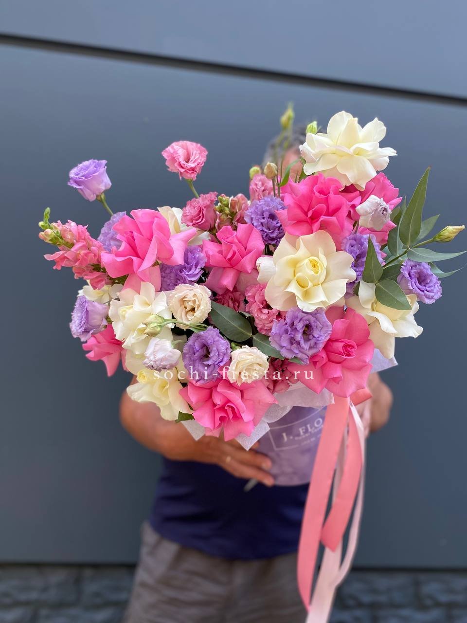 пионы, одноголовые розы, эустома, маттиола (аналог вне сезона), эвкалипт, лента, цилиндр D20.