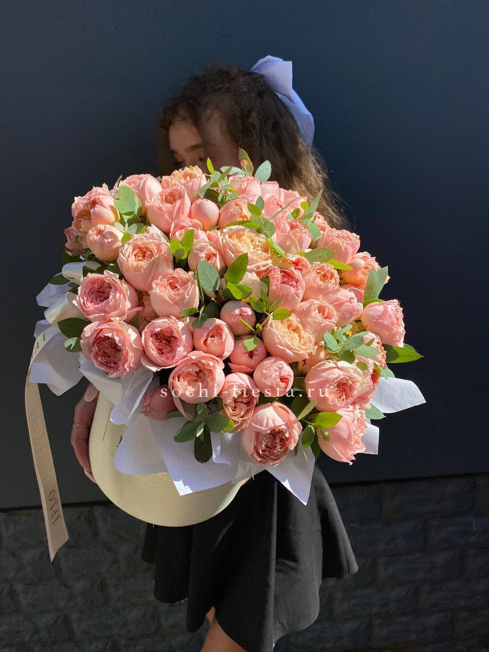кустовые пионовидные розы сорта Джульетта, цилиндр D20, эвкалипт, лента, тишью.