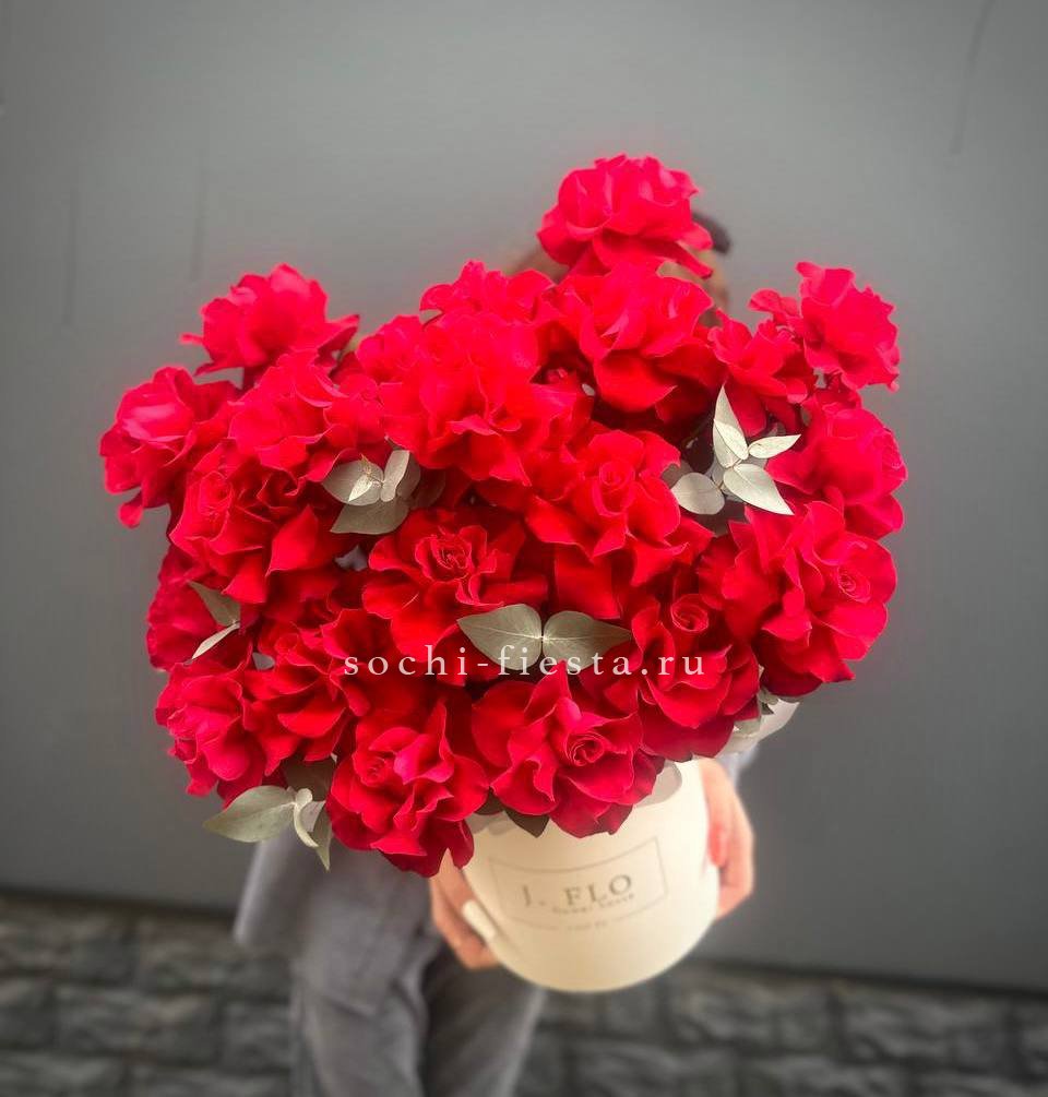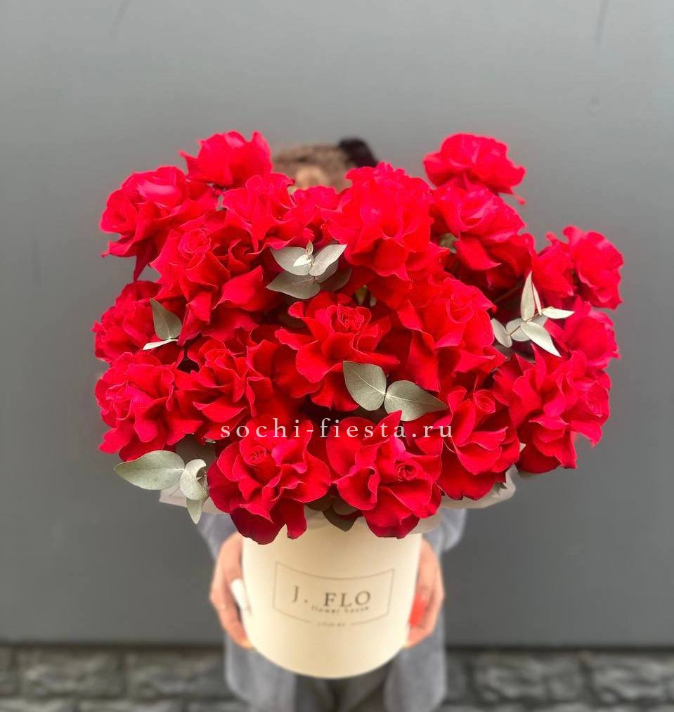 Семь веточек кустовой розы Мисти баблс собраны в круглую форму и дополнены свежим эвкалиптом. Компактная коробка с воздушной бумагой тишью сохраняет композицию аккуратной и готовой к вручению.