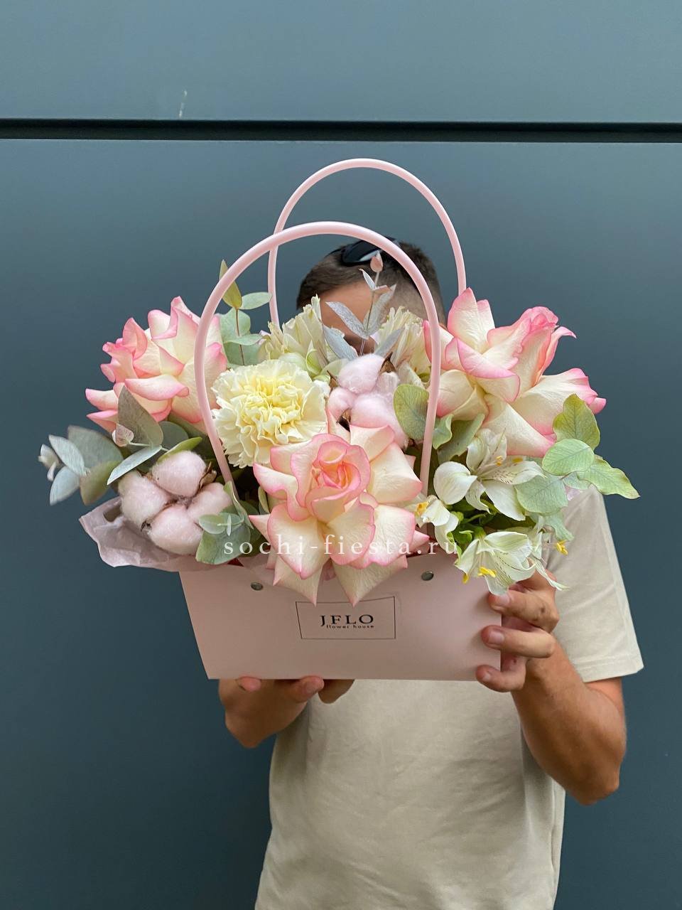 Гортензии задают плотную основу, герберы и диантусы вносят ритм, а альстромерии с эустомой создают движение вверх. Разнообразие форм и оттенков выстраивает многослойную картину в одной сумке.