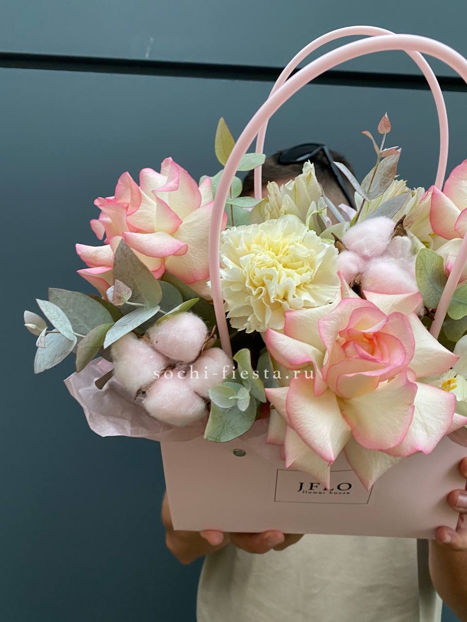 гортензия, герберы, диантусы, роза, альстромерии, эустомы, лента, эвкалипт,  сумка-кашпо.