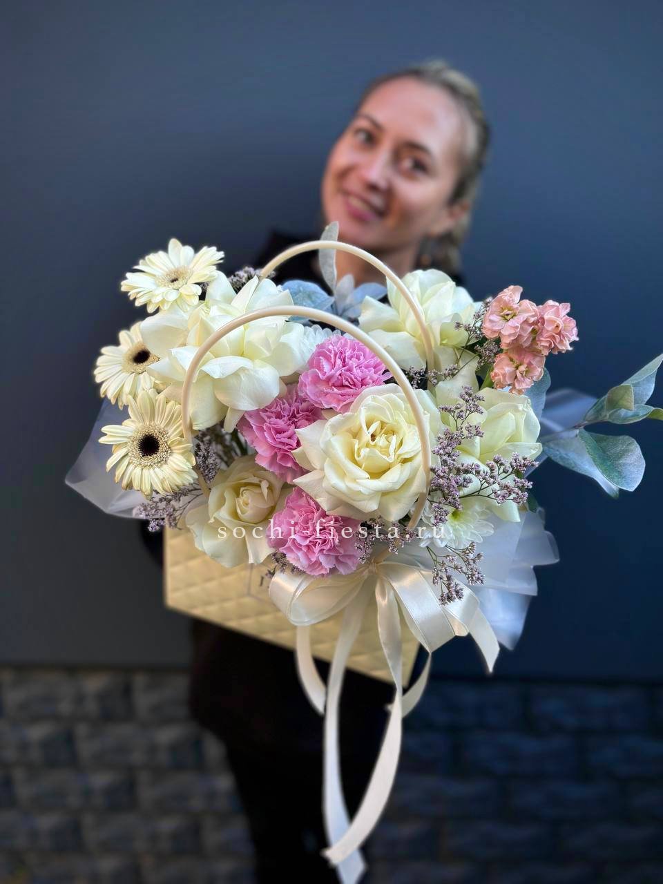 герберы , диантусы, белая роза, маттиола, хризантема кустовая, лента, сумка-кашпо.