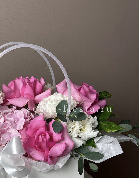 Гортензия заполняет пространство пышными соцветиями, розы и эустома расставляют акценты. Диантус и эвкалипт дополняют картину зеленью и мелкими деталями. Компактная форма удобна для размещения.