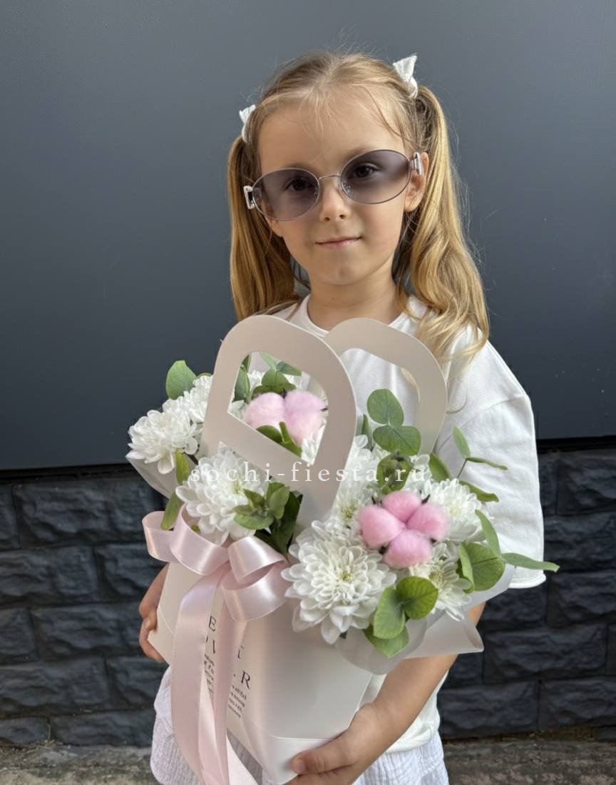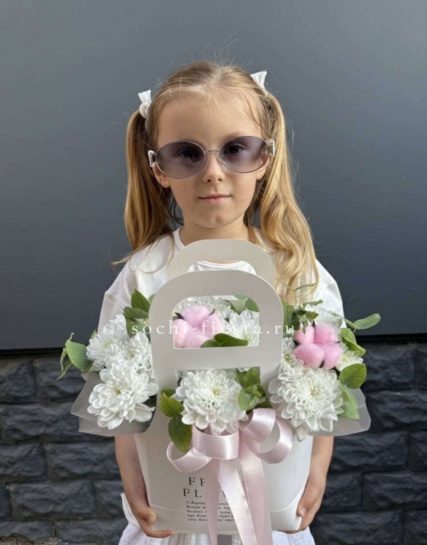 Хризантемы и диантус в удобной сумочке держат форму долго и выглядят свежо несколько дней. Лагурус добавляет текстуры, а эвкалипт дополняет композицию природной естественностью.