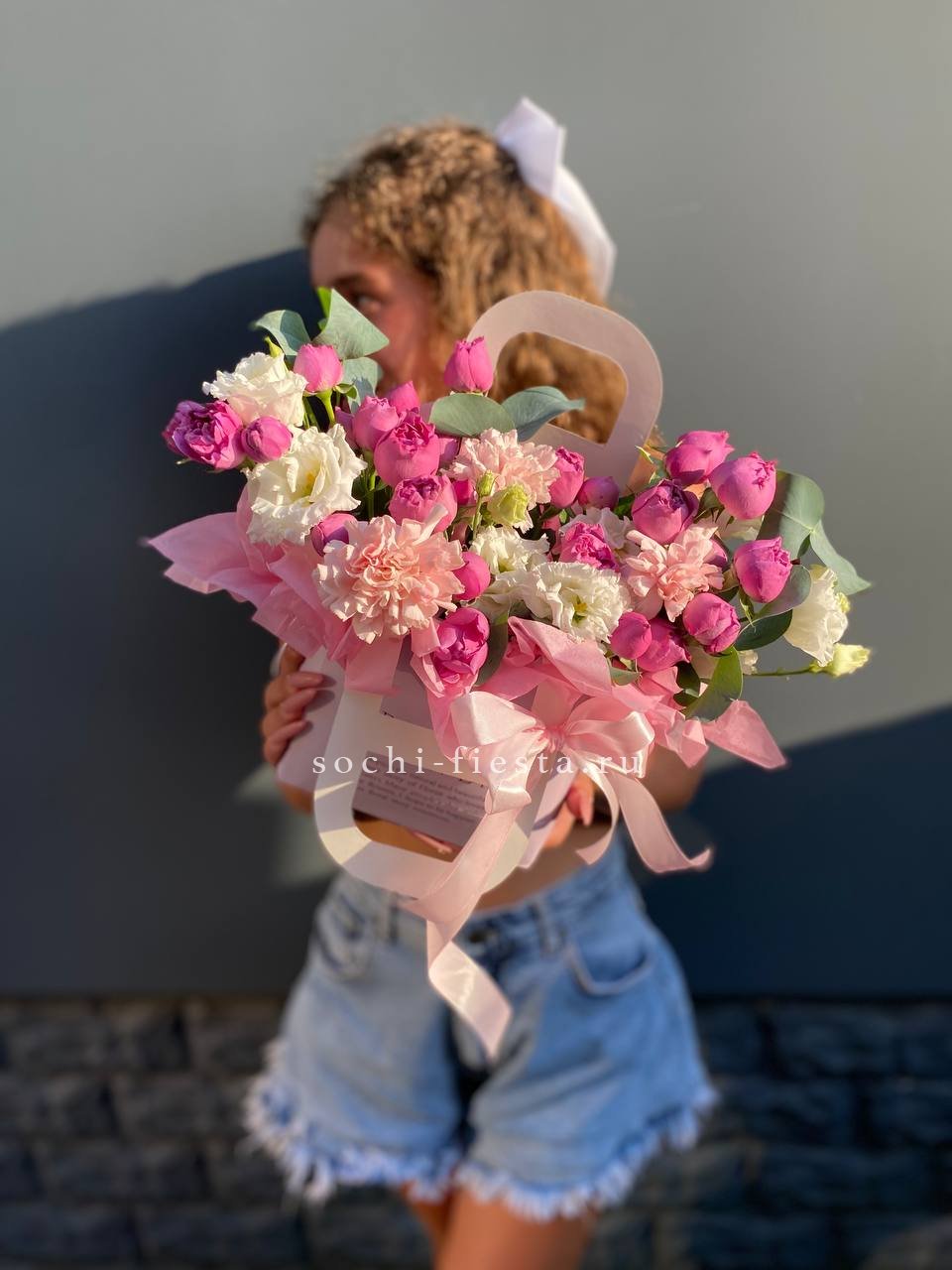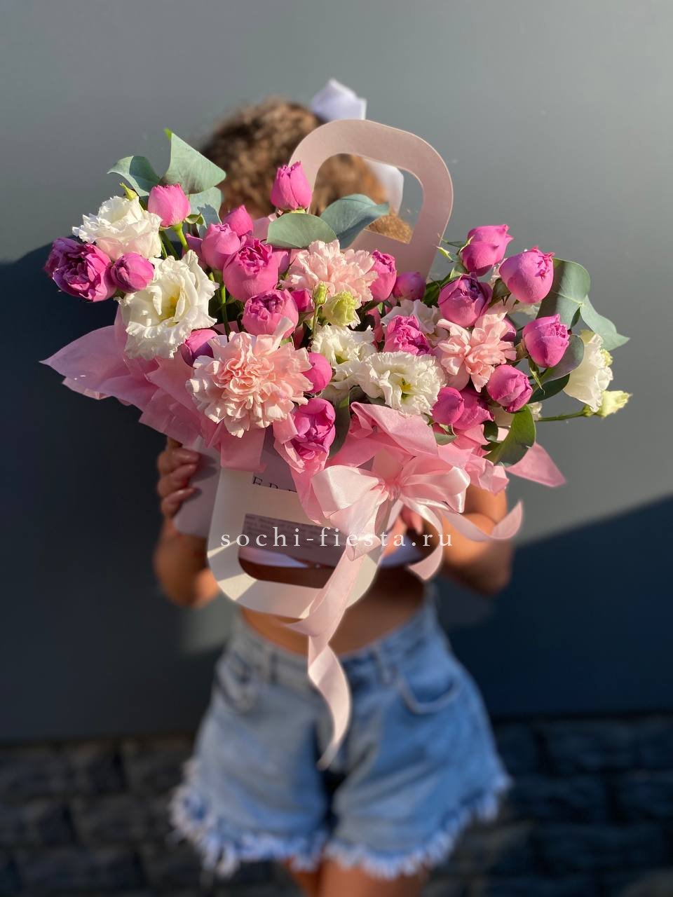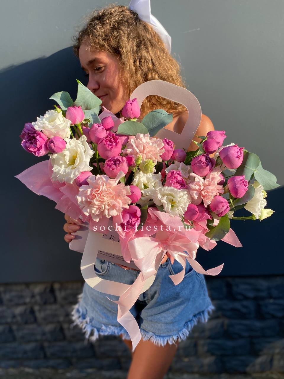 Для заказа товара "Сумочка с кустовой розой и диантусами" с доставкой в Рыбинске нажмите в корзину