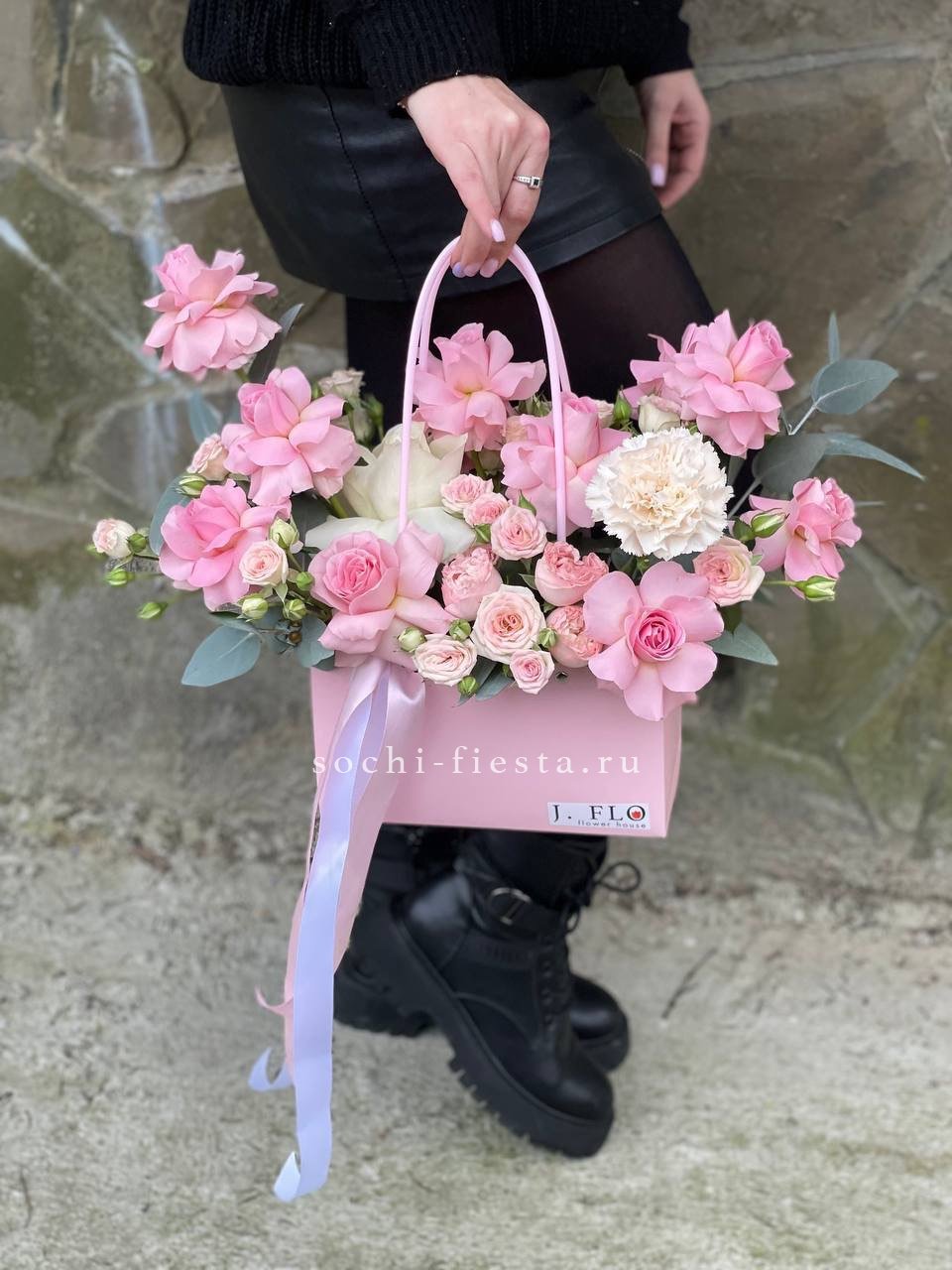 сумочка, хризантема, розовые розы, диантус, эвкалипт.
