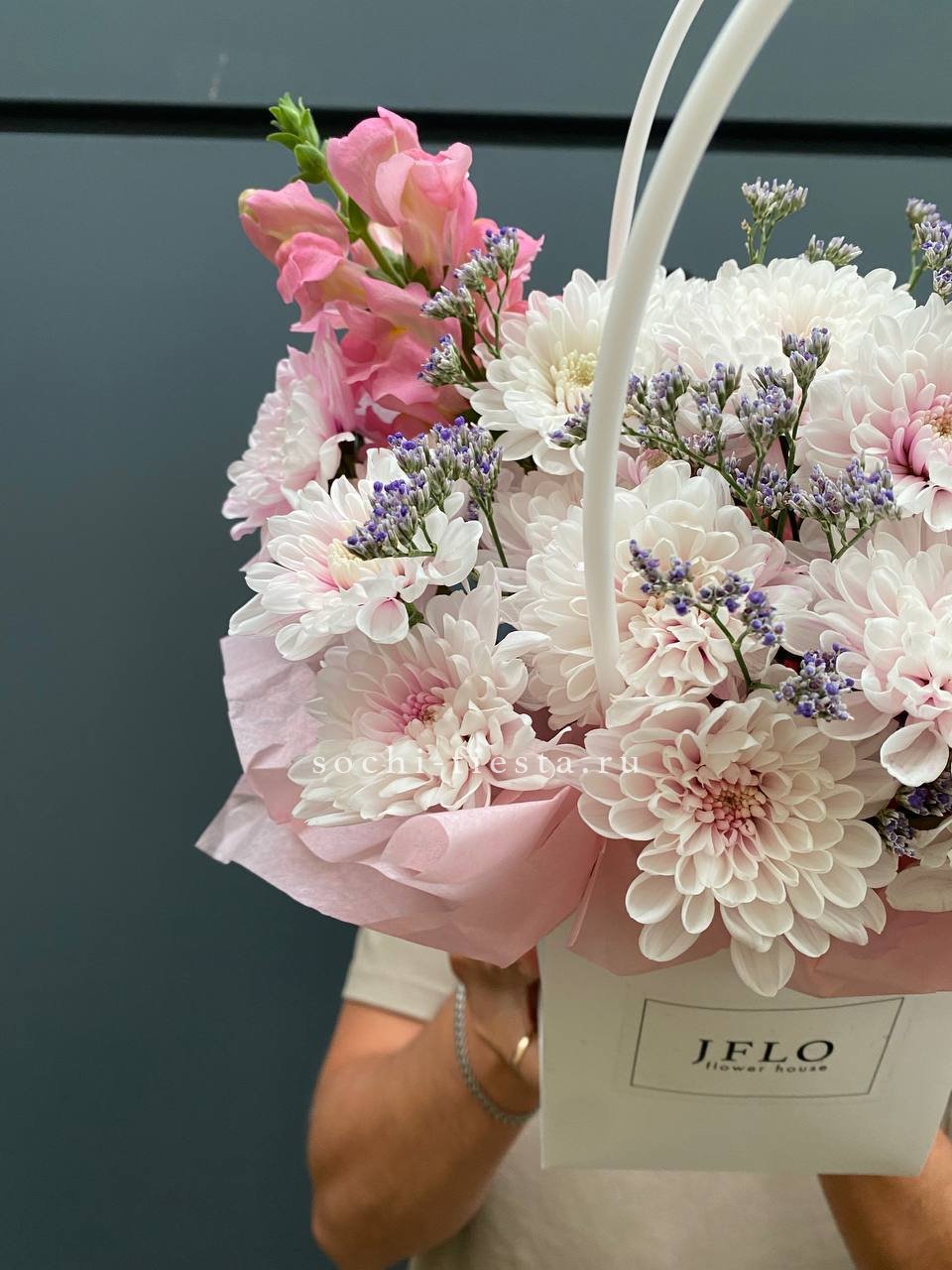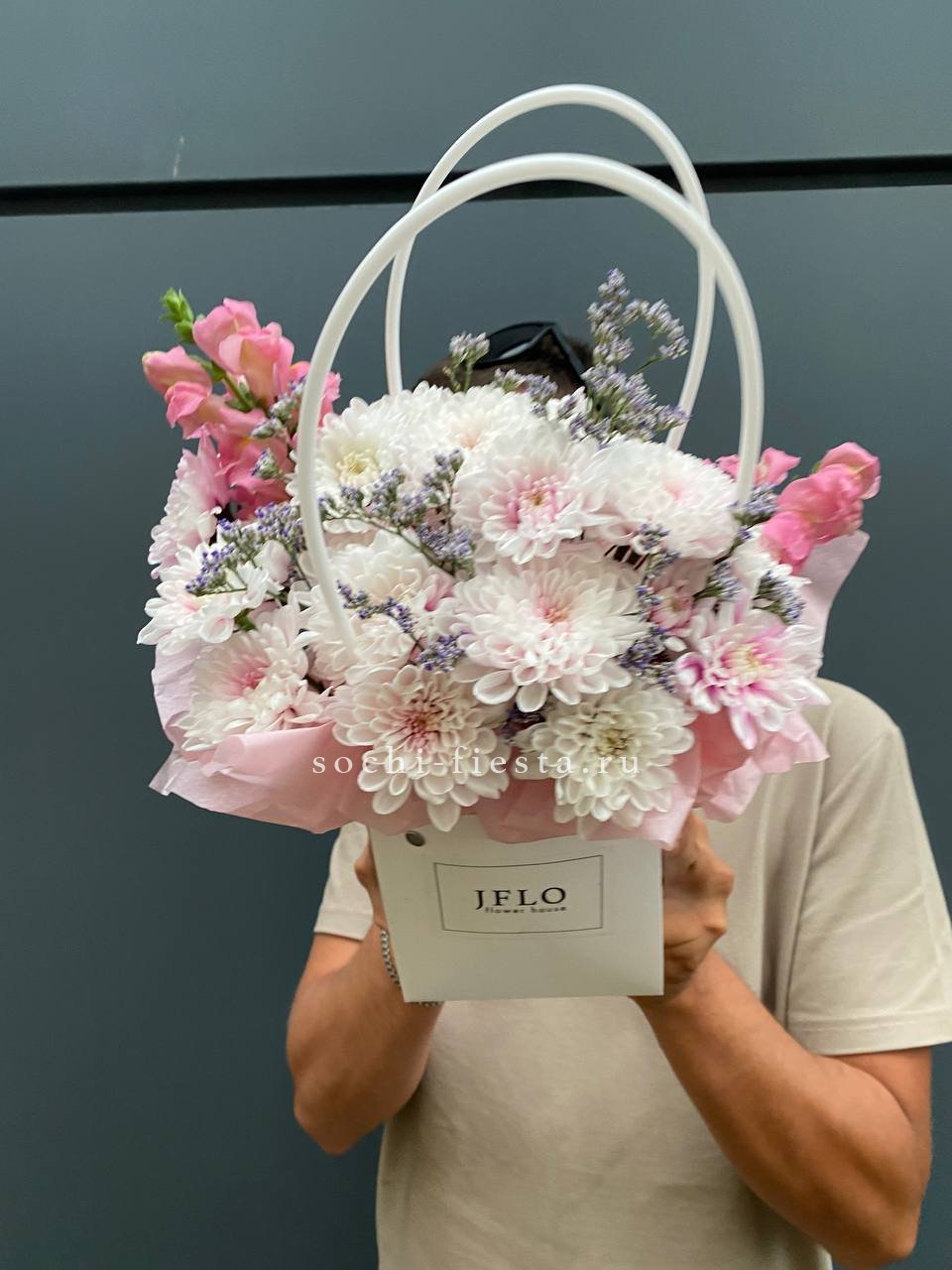 Миниатюрная композиция в удобной сумочке сочетает пышные головки хризантем с бархатистыми розами и воздушным диантусом. Веточки эвкалипта добавляют свежести, а компактная форма позволяет разместить цветы на рабочем столе или прикроватной тумбе.