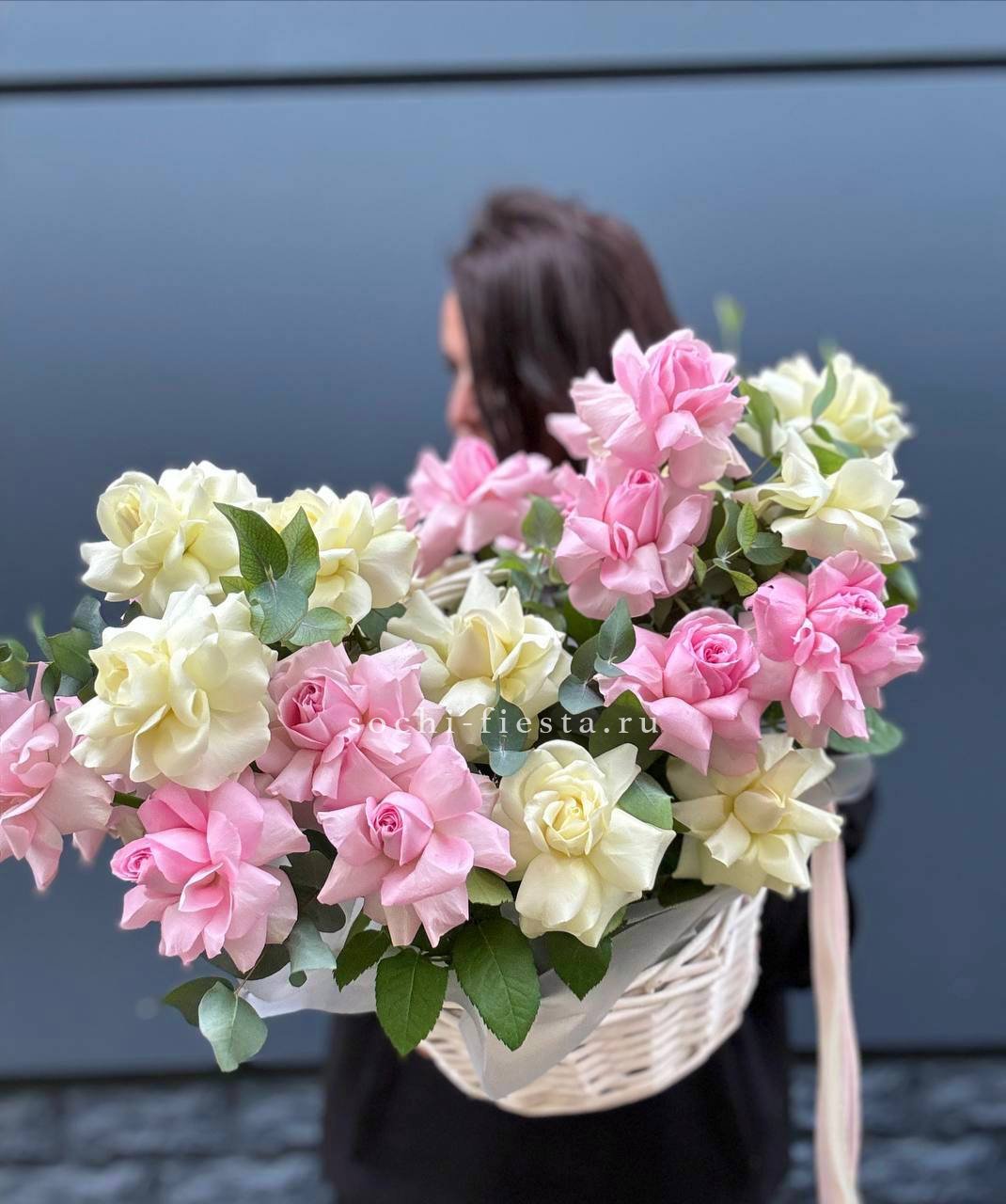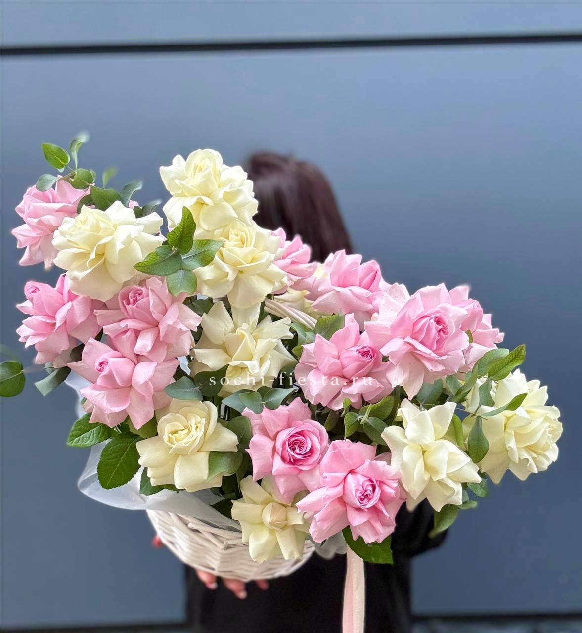 белые розы высокие в корзине.