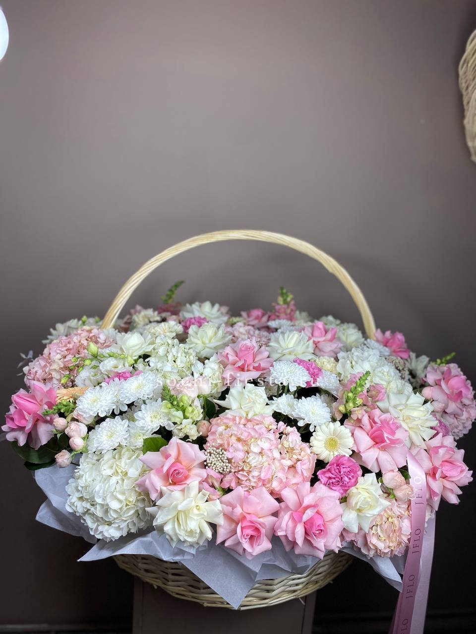 Восемь видов цветов складываются в harmonичную композицию со светлой корзиной в основе. Диантусы и эустома перекликаются с розами, а гортензия задает мягкий объем всей структуре.