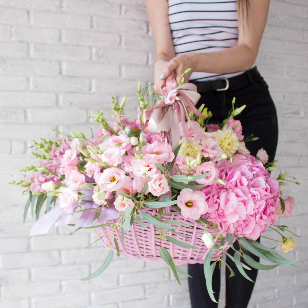 Широкая корзина вмещает пышную композицию из гортензий, эустом и пионовидных роз. Цветы располагаются свободно, создавая впечатление садовой клумбы, перенесенной в интерьер.