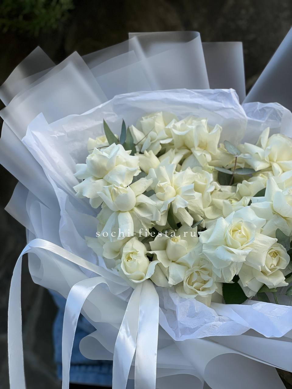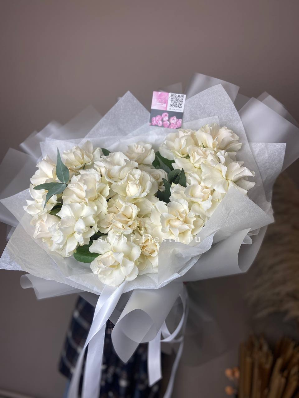 розы, диантусы, пионовидные кустовые розы, гортензия, эвкалипт, вспомогательная зелень, лента, дизайнерская упаковка.