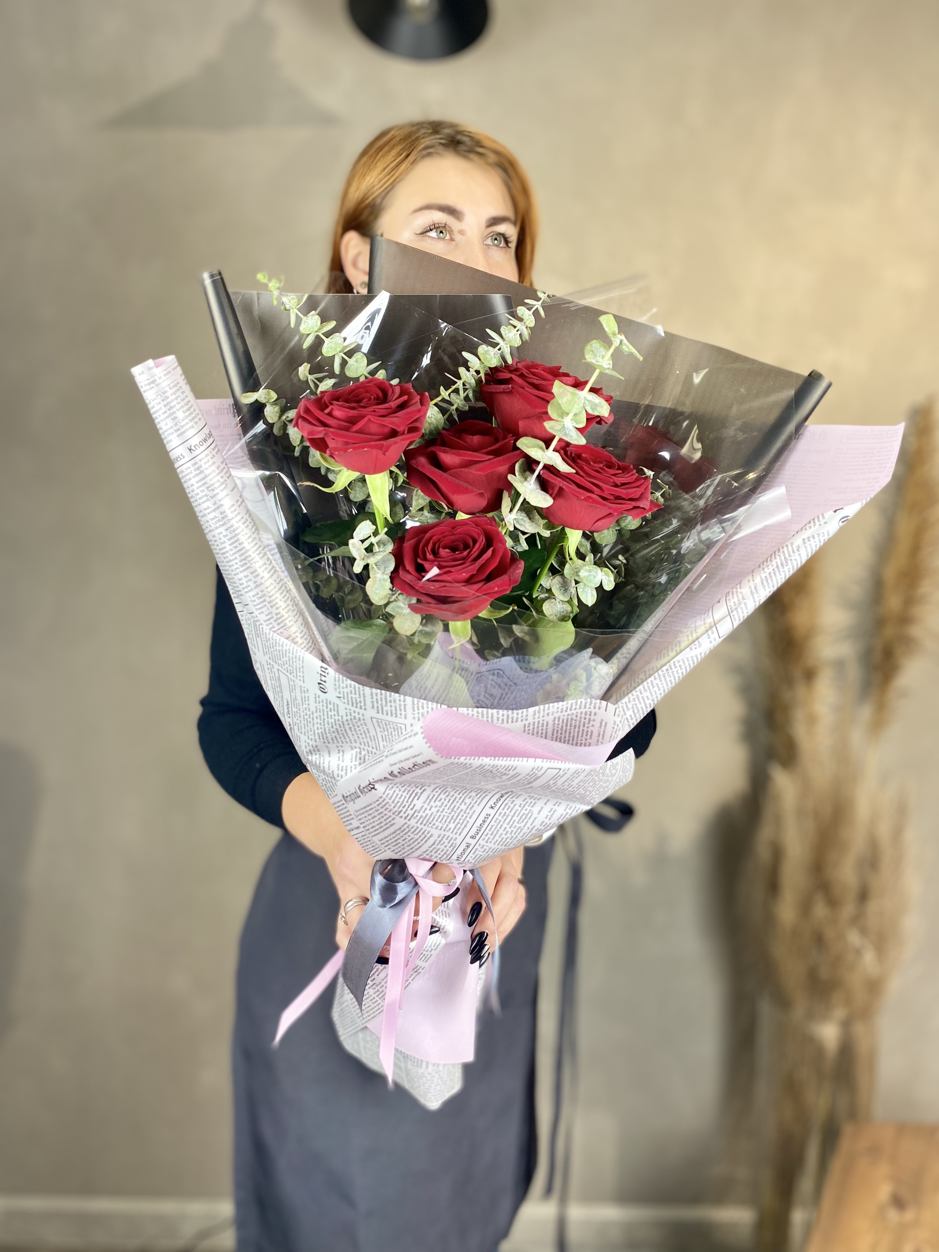 розы, кустовые розы, гортензия, маттиола (или аналог вне сезона), эустома, эвкалипт, лента, дизайнерская упаковка.
