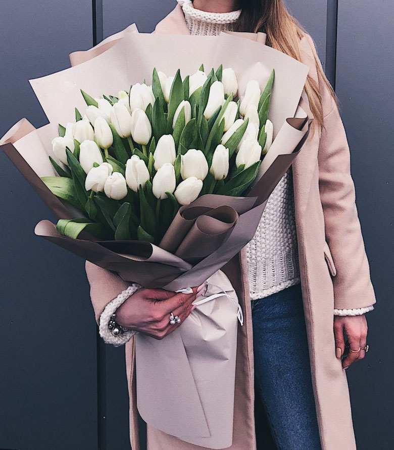 Двадцать девять белоснежных бутонов собраны в плотную округлую форму. Чистая монохромная подача раскрывает графичность линий и свежесть весеннего настроения.