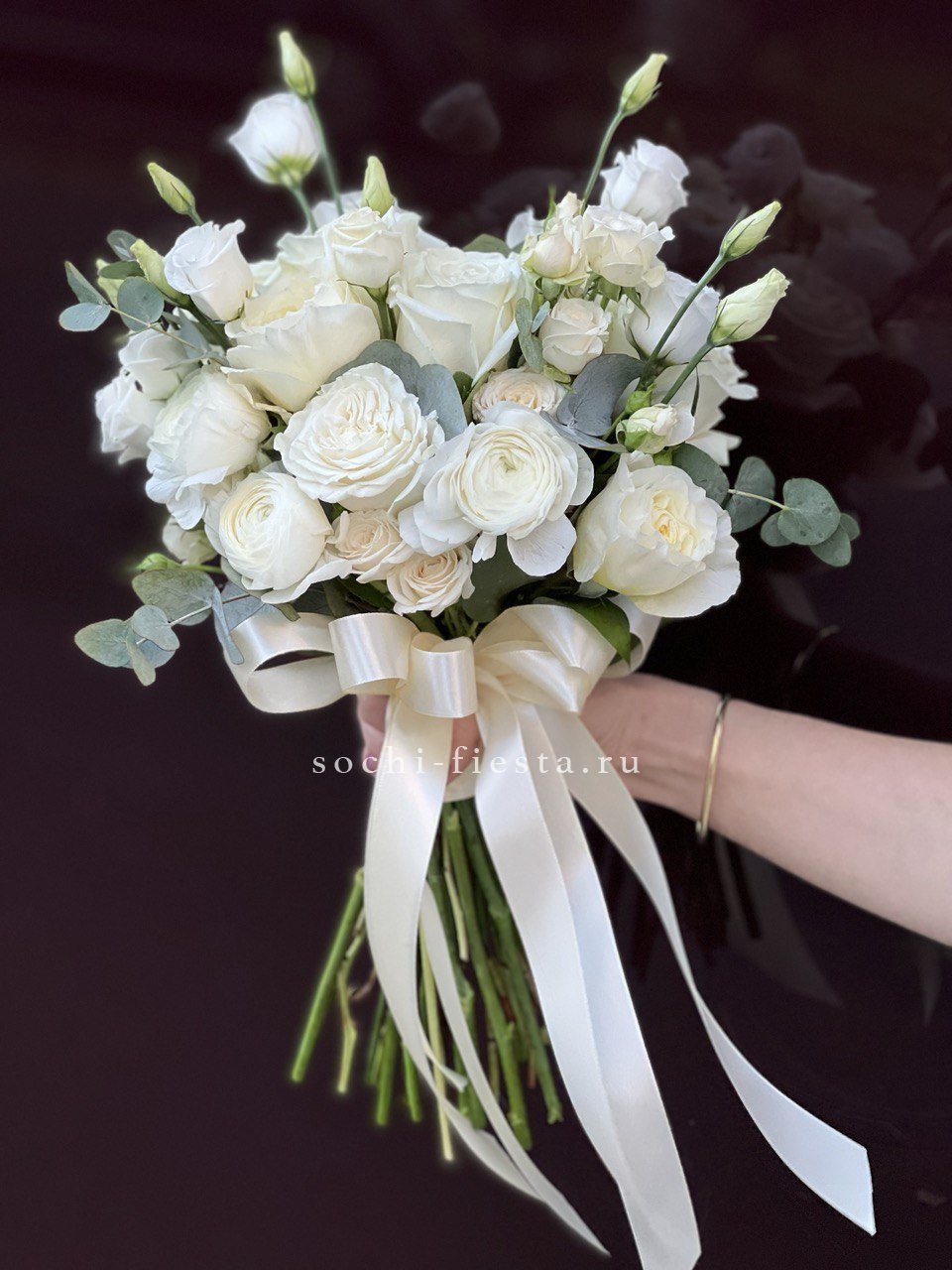 Свадебная композиция из роз эустомы и сезонных акцентов держит форму и остается свежей долгое время. Эвкалипт завершает структуру букета добавляя практичности торжественному образу.