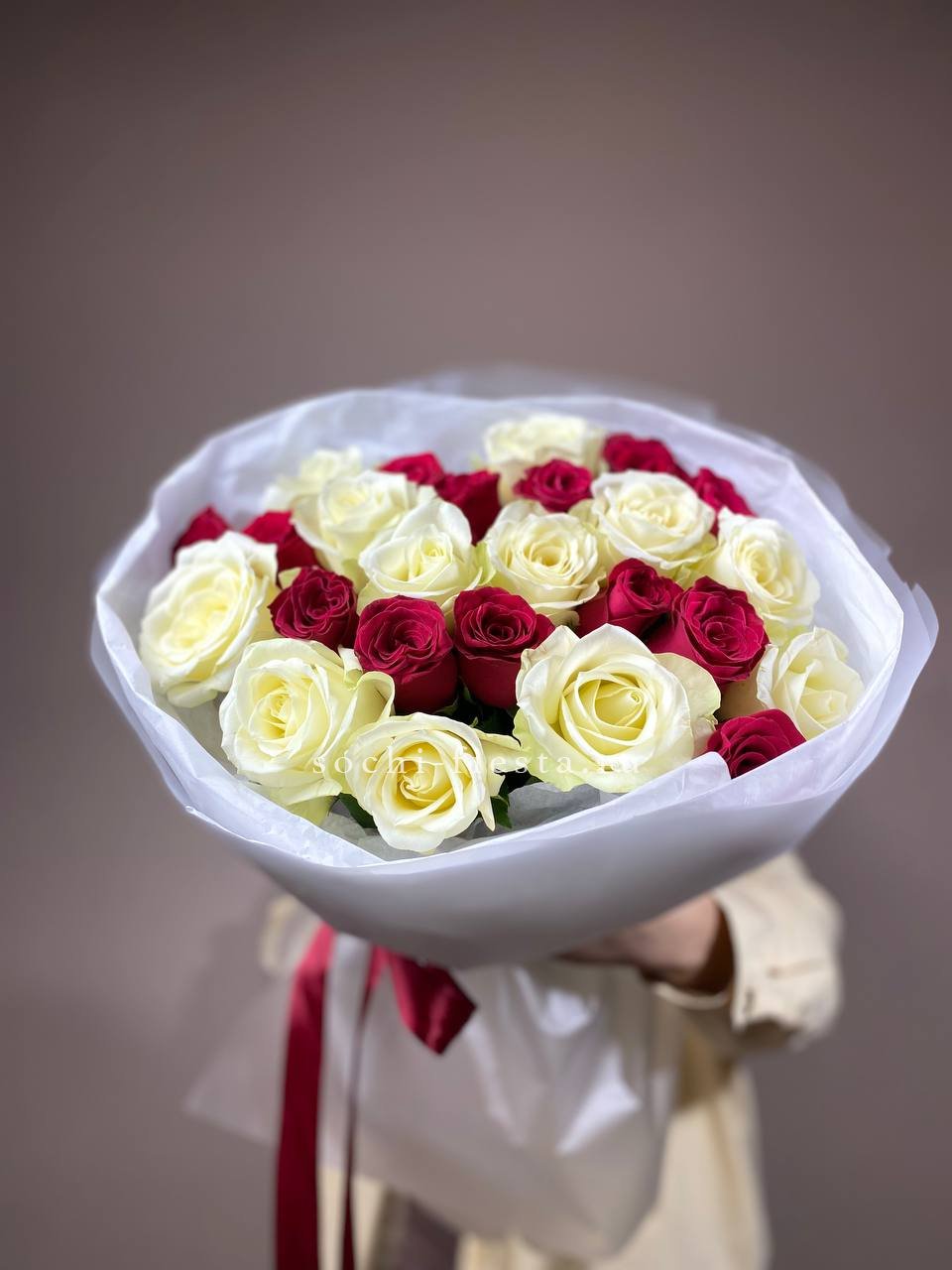 Для заказа товара "Букет их красных и белых 25 роз" с доставкой в Рыбинске нажмите в корзину