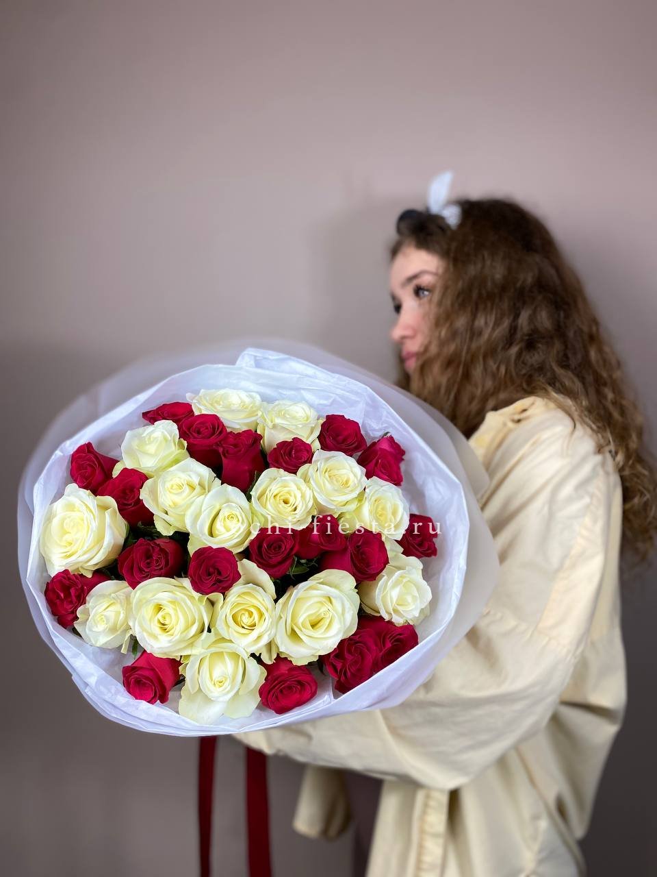 Для заказа товара "Букет из красных белых 35 роз" с доставкой в Рыбинске нажмите в корзину